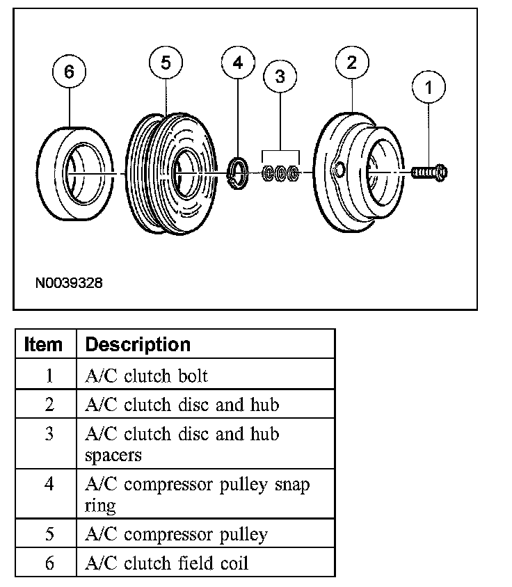 - Internal FS18 A/C compressor components are not serviced separately. The A/C compressor is serviced only as an assembly. The clutch disc and hub, A/C compressor pulley and bearing, and clutch field coil are serviceable.