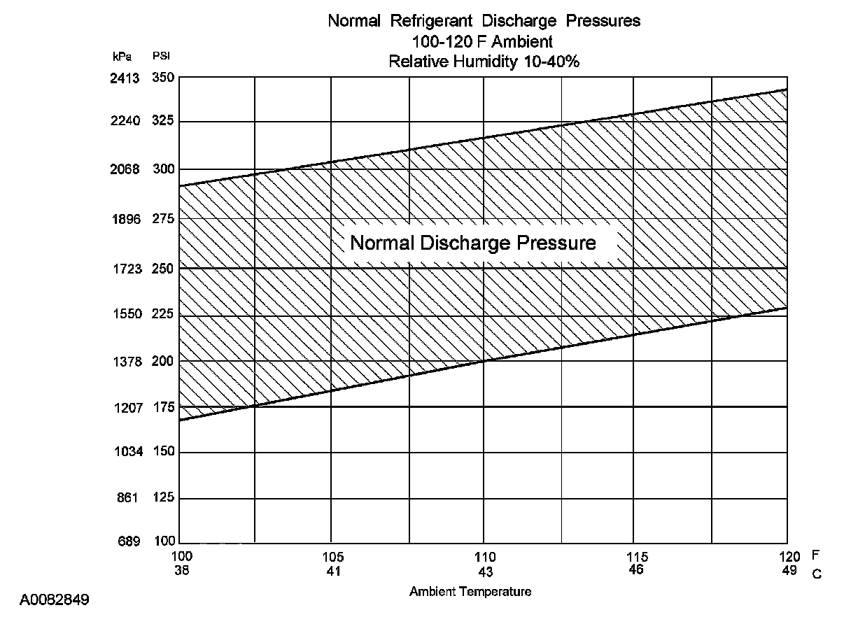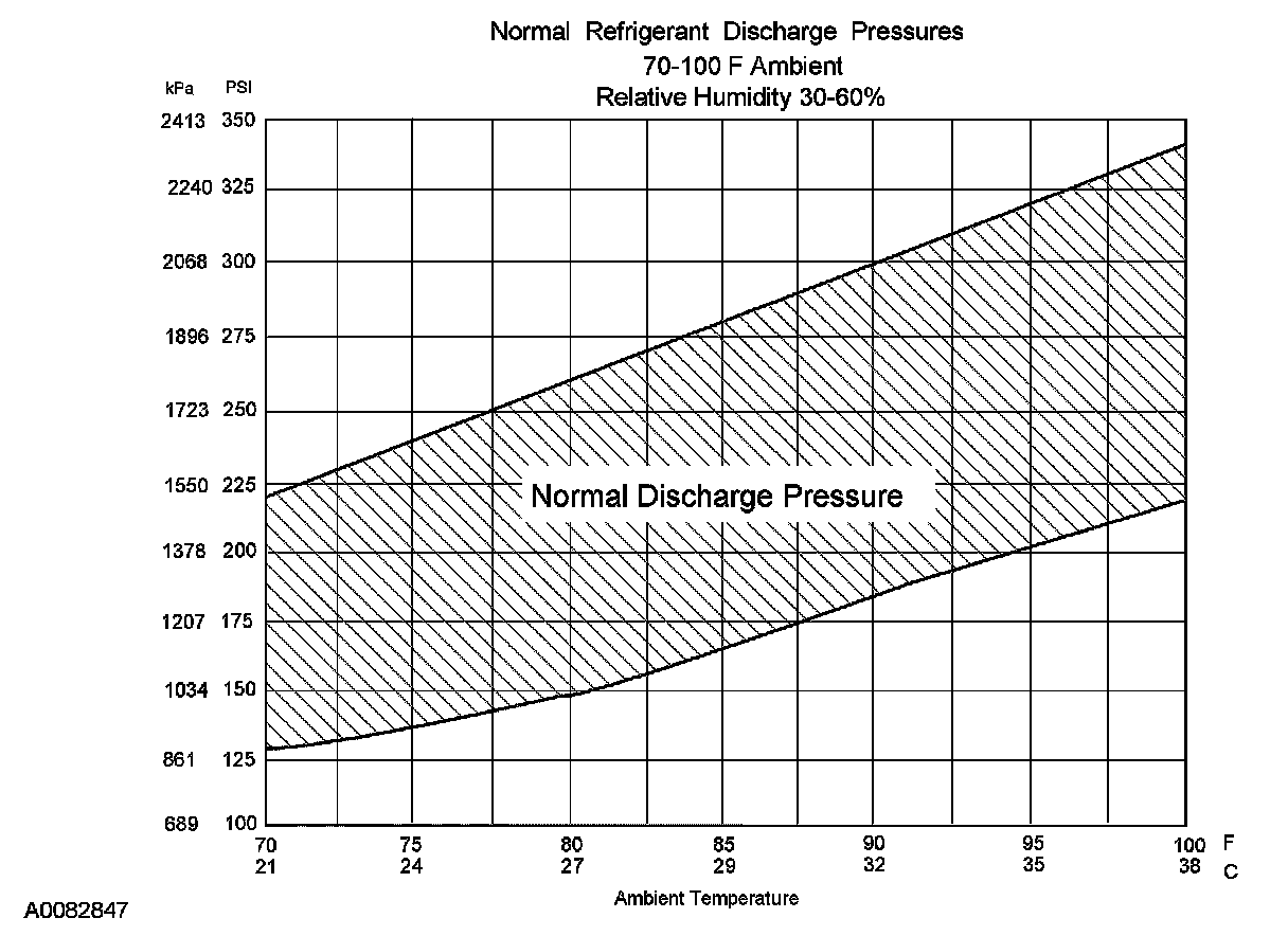 8. Determine if the discharge pressure falls within the normal operating limits using the Normal Refrigerant Discharge Pressures chart.
