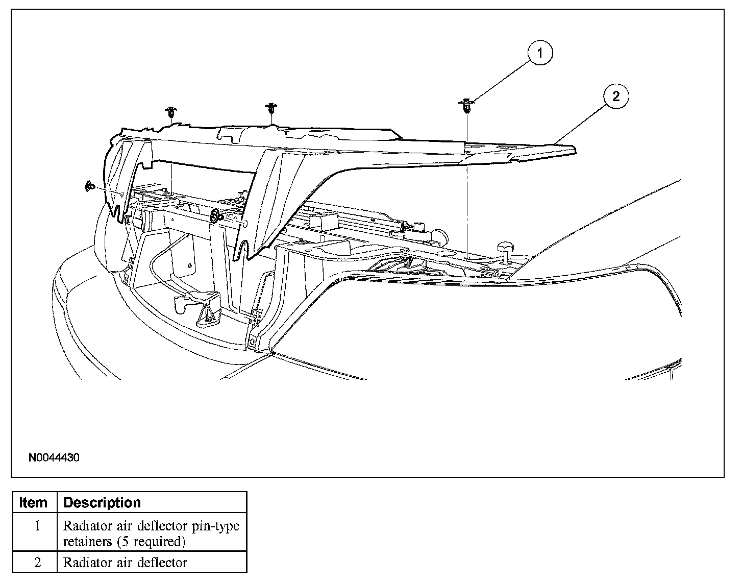 1. Remove the 5 pin-type retainers and the radiator air deflector.
