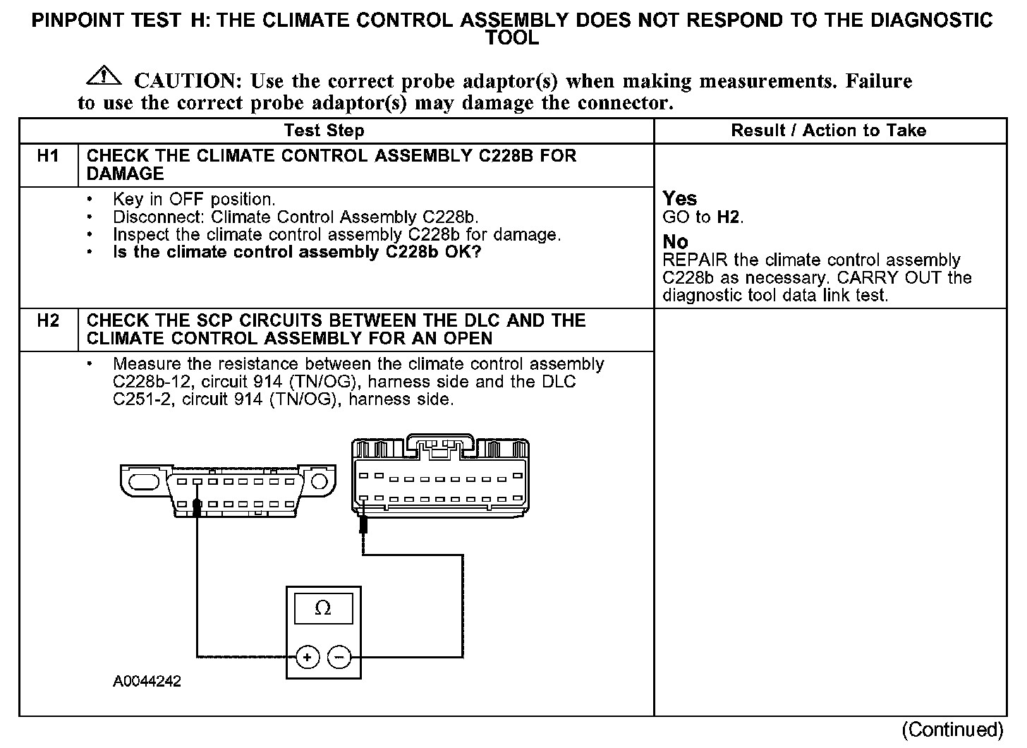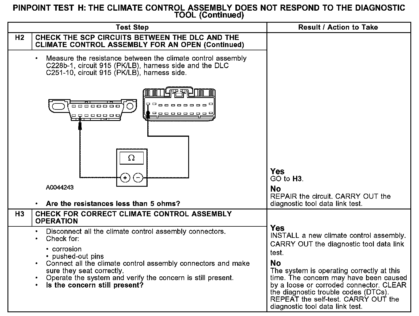 The climate control assembly communicates with the diagnostic tool through the standard corporate protocol (SCP) communications network, circuits 914 (TN/OG) and 915 (PK/LB). Check the SCP circuits between the climate control assembly C228b and the data link connector (DLC) C251. The total resistance values must not be more than 5 ohms. If the resistance is more than 5 ohms, there is an open circuit in the SCP network, damage to the DLC C251, or damage to the climate control assembly C228b.