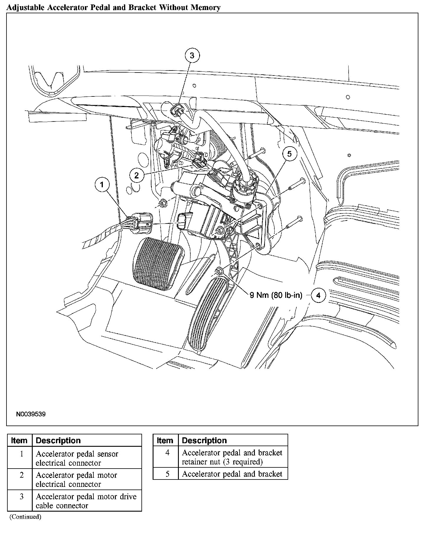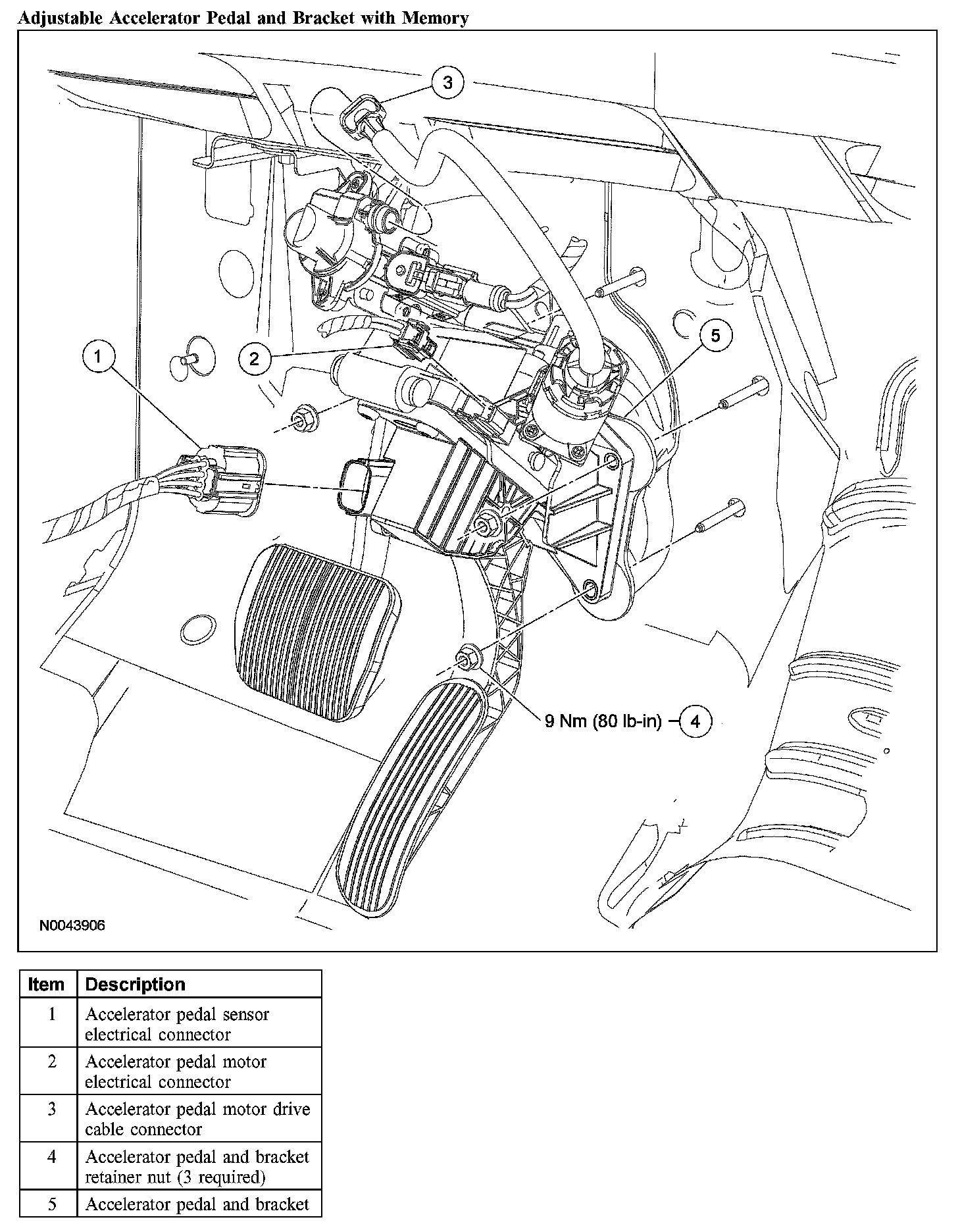 2. Install the 3 accelerator pedal and bracket retaining nuts. Tighten nuts to 9 Nm (80 lb-in).