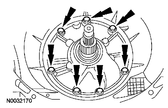 32. Remove the alignment pin and install the front pump bolts.