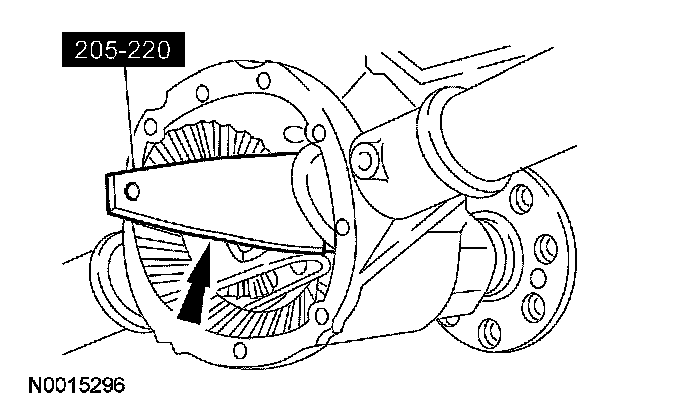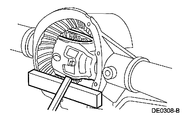 CAUTION: Place a wood block between the pry bar and the axle housing to protect the machined surface from damage.