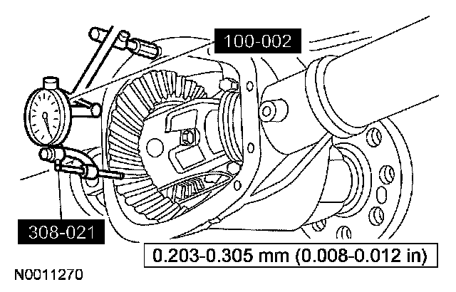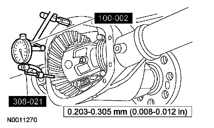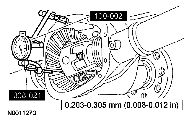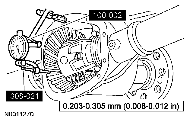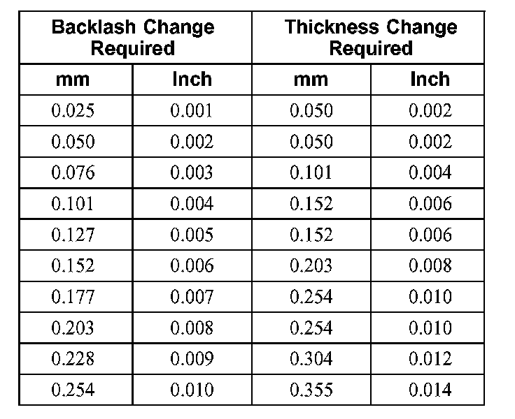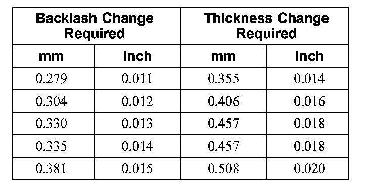 11. If a zero backlash condition occurs, add 0.51 mm (0.020 inch) to the RH side and subtract 0.51 mm (0.020 inch) from the LH side to allow backlash indication. Measure the backlash. Refer to Measuring backlash in this procedure.