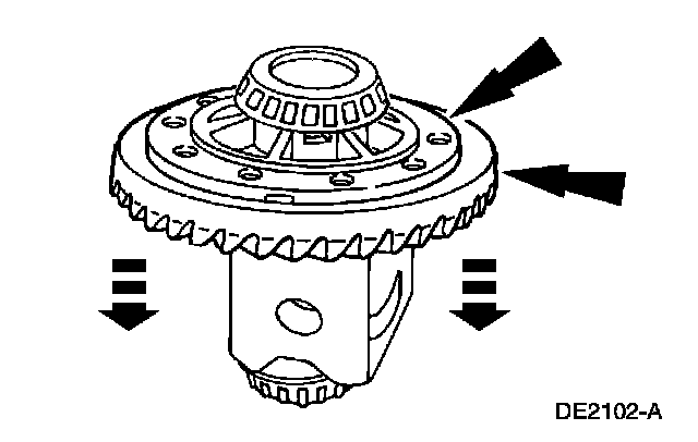 2. Position the differential ring gear and the differential case. Align the bolt holes by starting 2 bolts through the holes in the differential case and the differential ring gear. Press the differential ring gear on the differential case.