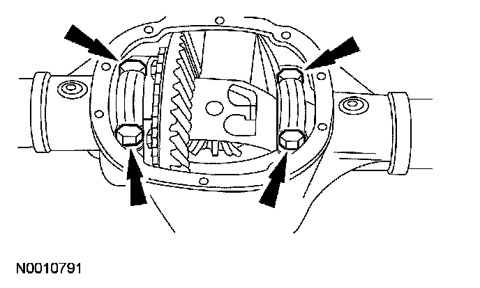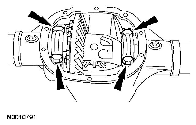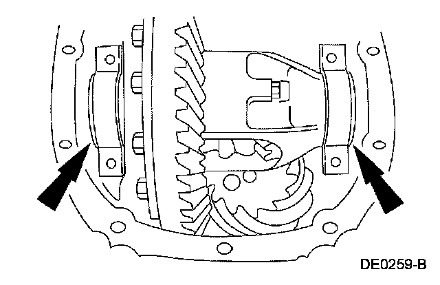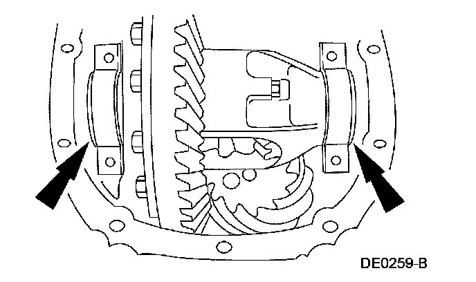 6. CAUTION: Mark the position of the differential bearing caps, as the arrows may not be visible. Always install the bearing caps in their identical locations and positions.
