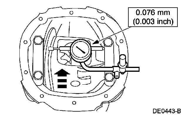 10. If the differential ring gear backlash variation between teeth measurement, taken at the beginning of this procedure, did not exceed the specification, proceed to Step 14. If the differential ring gear backlash variation between teeth measurement, taken at the beginning of this procedure, exceeded the specification, the cause may be a warped differential ring gear or differential case/differential bearing damage. Proceed as follows to verify the cause of the excessive backlash.