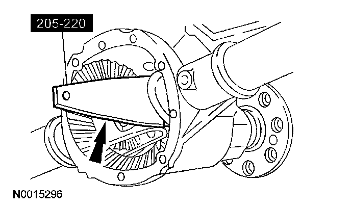CAUTION: Place a wood block between the pry bar and the differential housing to protect the machined surface from damage.