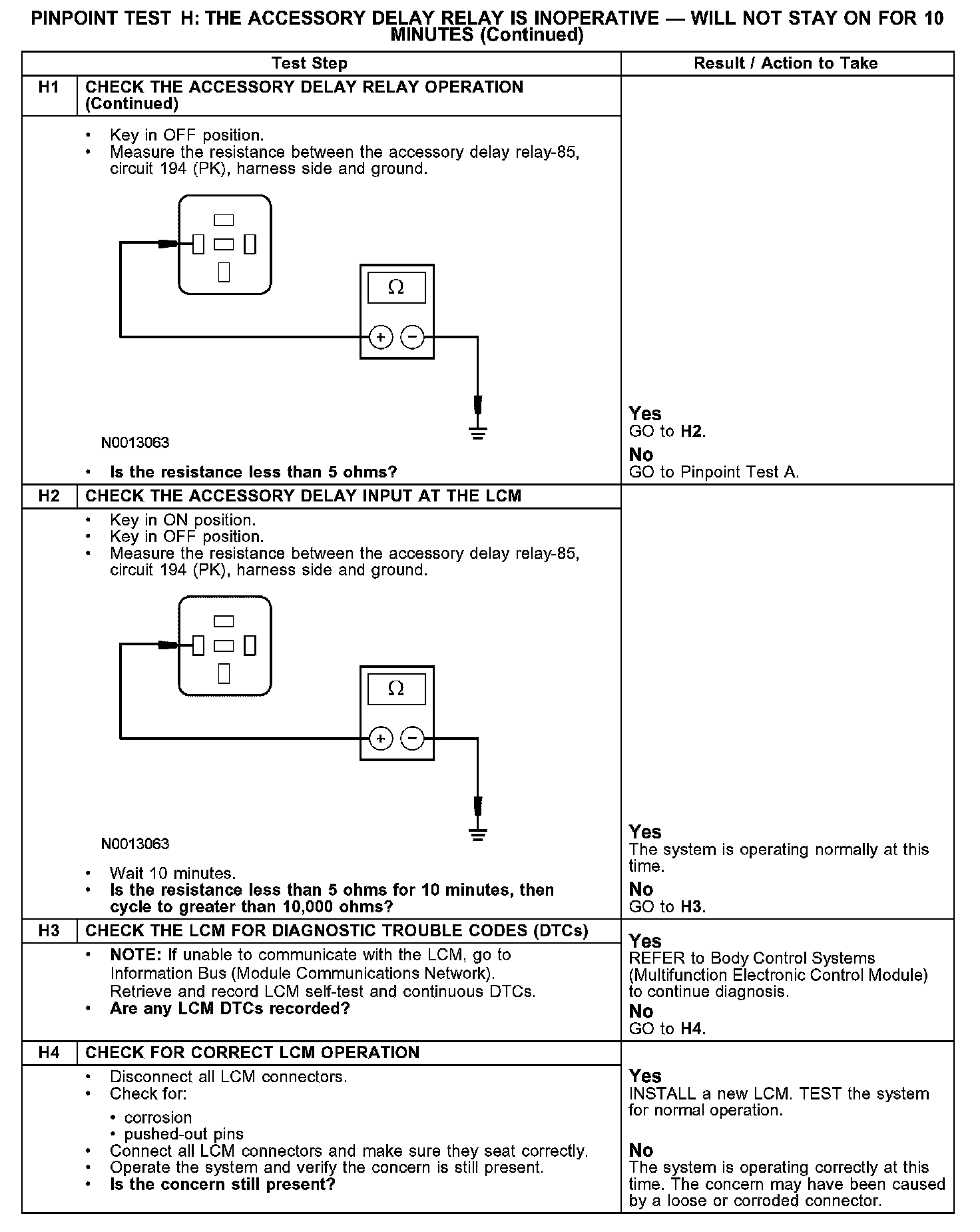 PINPOINT TEST H: THE ACCESSORY DELAY RELAY IS INOPERATIVE - WILL NOT STAY ON FOR 10 MINUTESH1:
