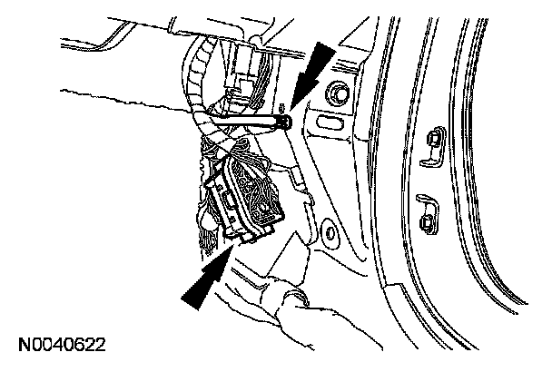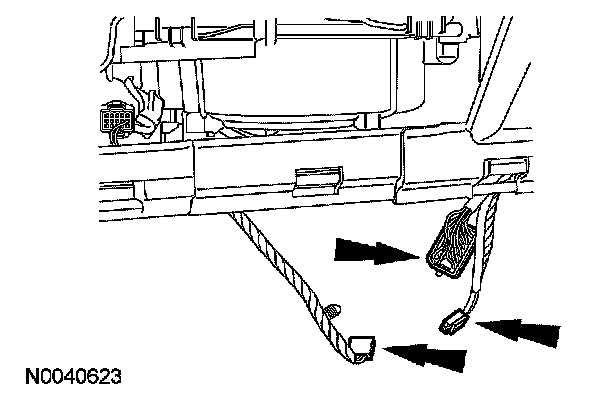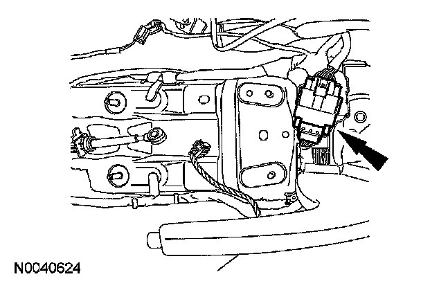 10. Disconnect the electrical connector and retainer located on the floor between the 2 front seats.