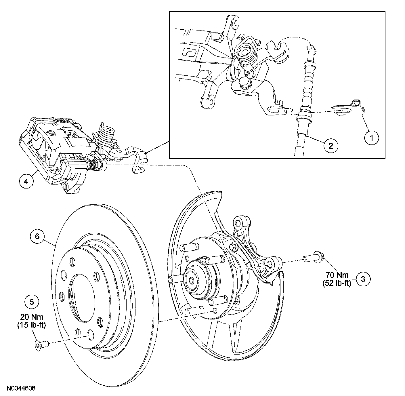 3. CAUTION: Do not allow the brake caliper to hang from the brake hose or damage to the hose can occur.
