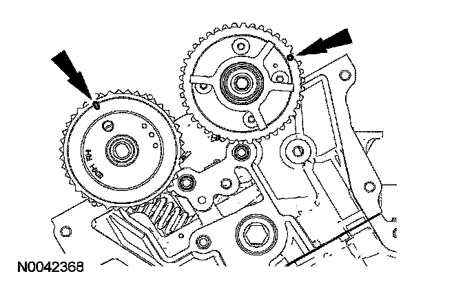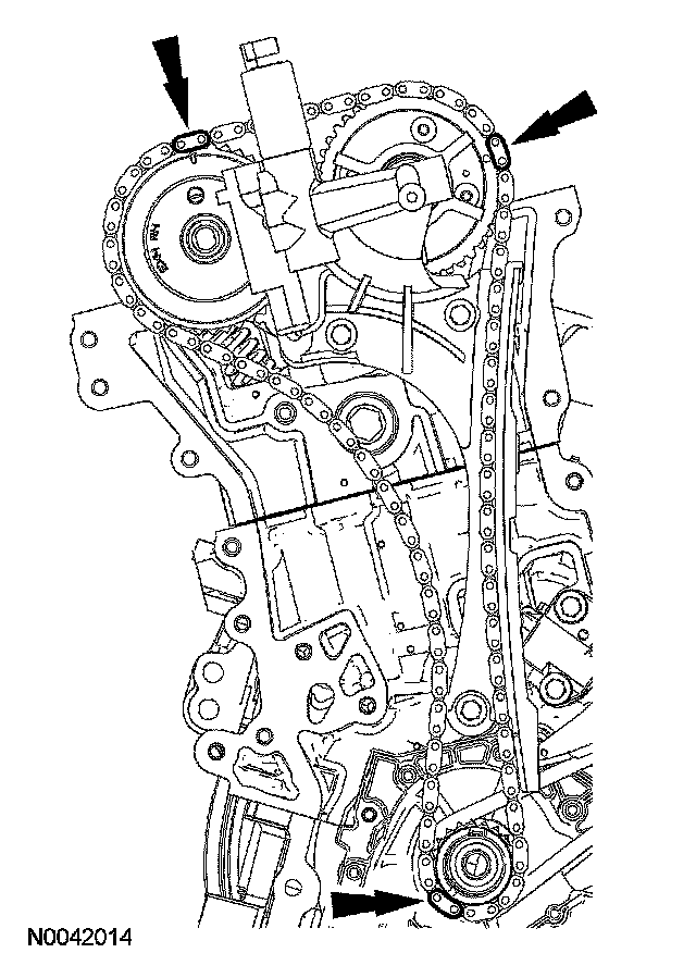 ^ Align the marks on the timing chain with the marks on the camshaft and crankshaft sprockets.