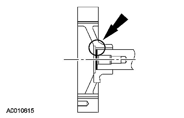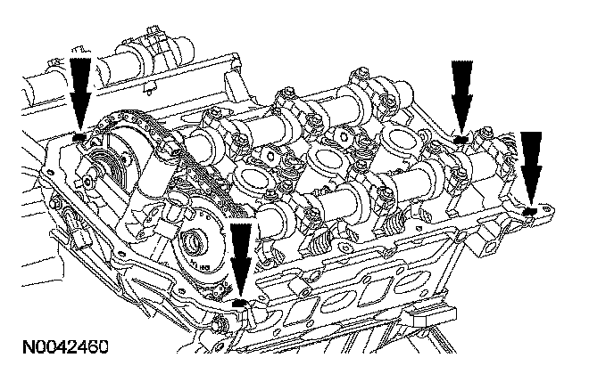 Apply a 8 mm (0.31 inch) dot of silicone gasket sealant to the front cover-to-cylinder head joints and the cam seal retainer-to-cylinder head joints.