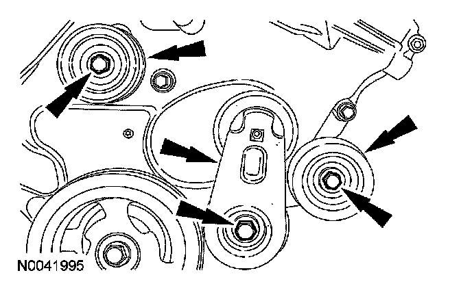 67. Install the accessory drive belt tensioner and the 2 idler pulleys.