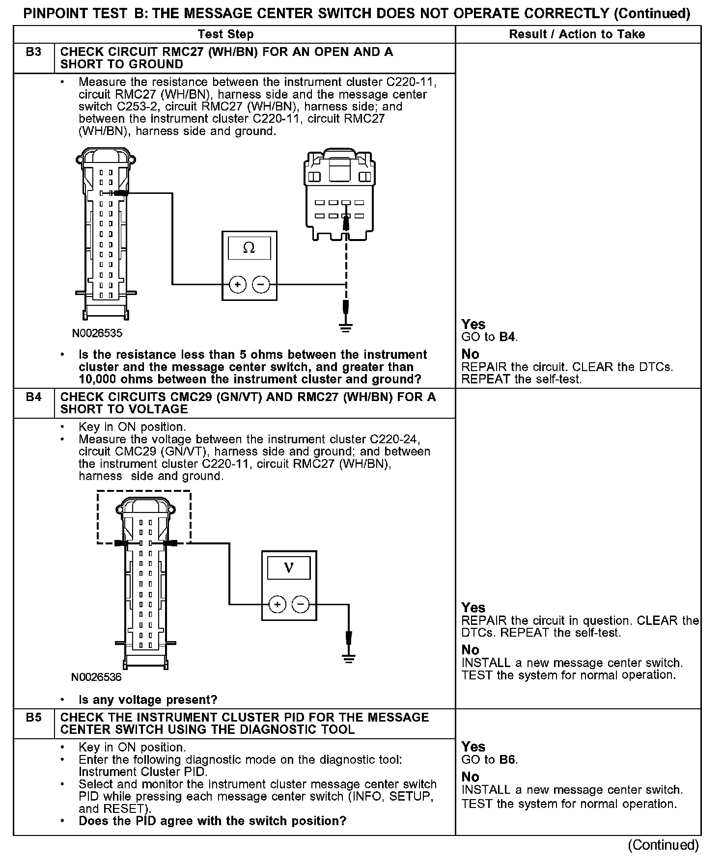 The message center switch is hardwired to the instrument cluster through circuits CMC29 (GN/VT) and RMC27 (WH/BN). To communicate the requested switch function, each message center switch button uses a different resistance value, allowing the instrument cluster to determine which switch is pressed.