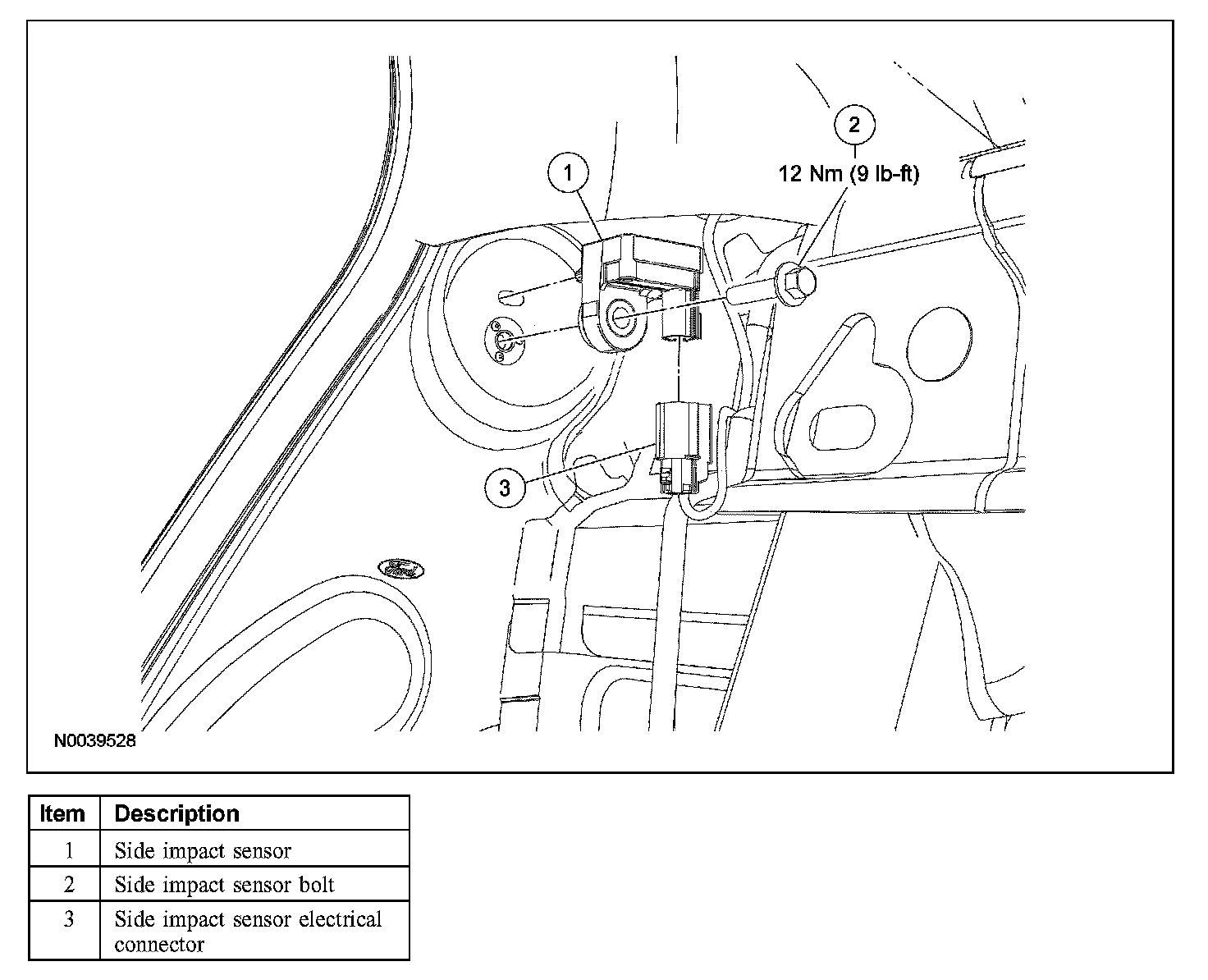 4. WARNING: The tightening torque of the air bag side impact sensor retaining bolts is critical for correct system operation.