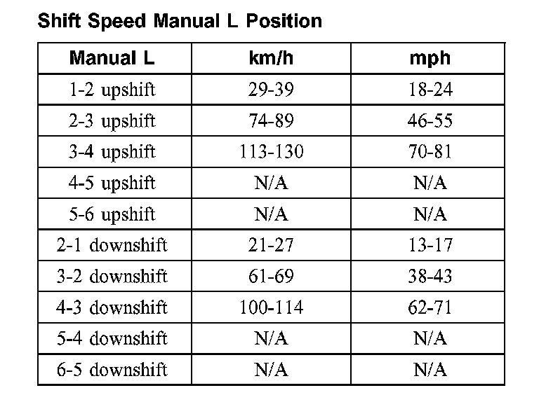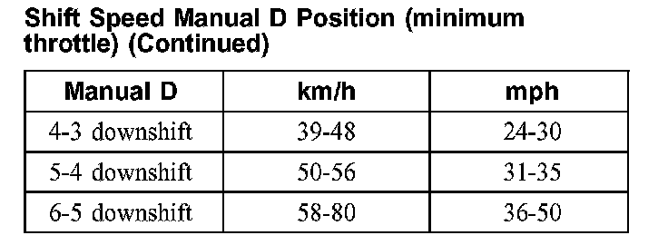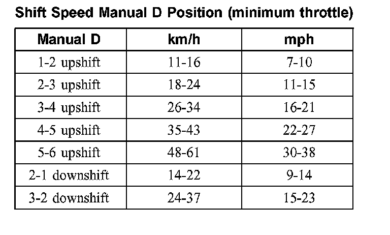 Shift Speed Manual D Position (minimum throttle):