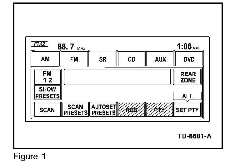 2. Verify RDS and PTY are enabled by the buttons being illuminated. If the text, above the SET PTY button says anything other than ALL, the unit is filtering for radio stations that transmit RDS text and are categorized as the selected Program Type, like: Top 40, Classical, and News. (See Figure 1)