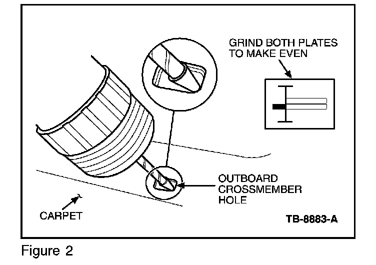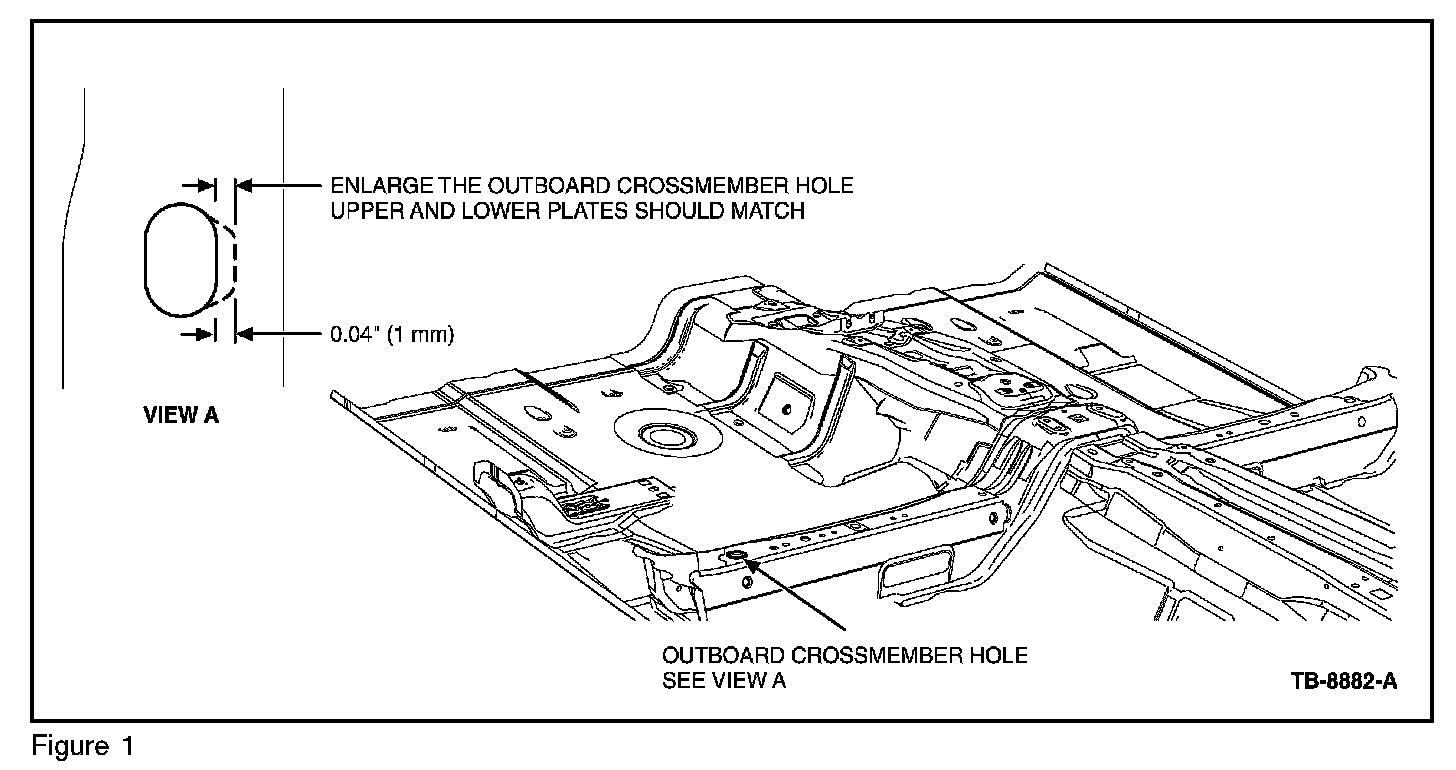 2. Using a die grinder, grind 0.04" (1 mm) on the right side of the hole on the outboard cross member hole. (Figure 1) If necessary, remove an additional 0.04" (1 mm) in order to get both the lower and upper sheet metal plates to match. (Figure 2)