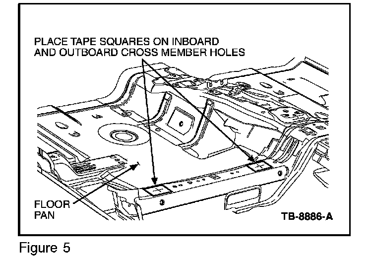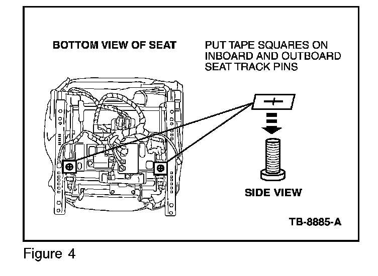 6. Put the tape squares on the inboard and outboard cross member holes and two (2) of the tape squares on the inboard and outboard seat track pins. (Figures 4 and 5)