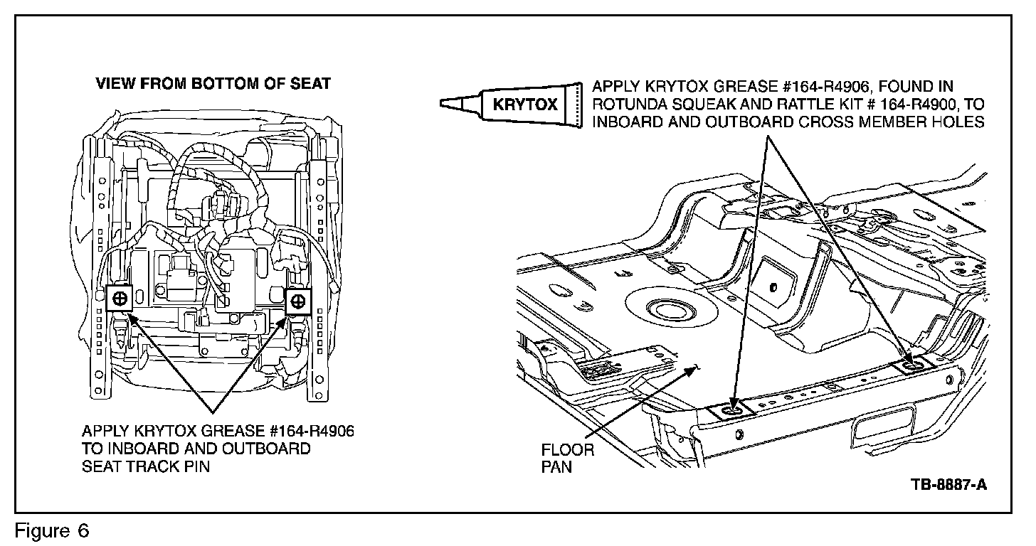 7. Add Kyrtox grease (164-R4906) from the Rotunda Squeak and Rattle Kit (164-R4900) on top of the square tapes for both outboard and inboard pins and both inboard and outboard cross member holes. (Figure 6)