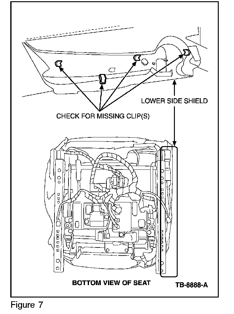 8. Inspect the lower side shield clip for proper installation by visually looking from the underside of the seat ensuring that the lower shield is properly installed in the track. If the clip is missing, replace the lower side shield. (Figure 7)