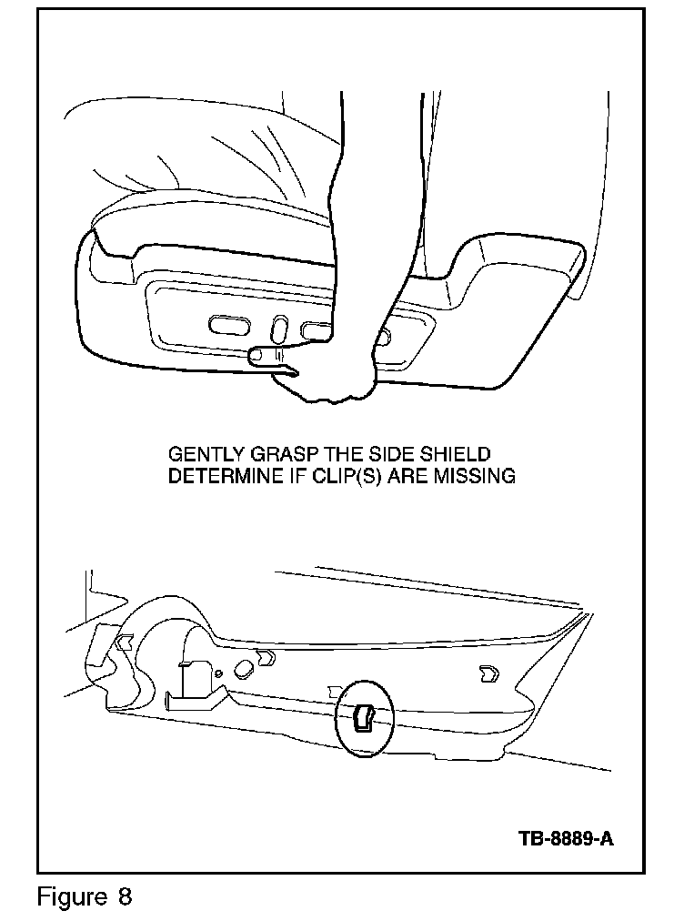 11. While sitting in the driver seat, gently grab the lower side of the seat side shield and lightly push up and down on the cover. If the shield is loose, replace the shield. If the shield is tight, proceed to Step 12. (Figure 8)