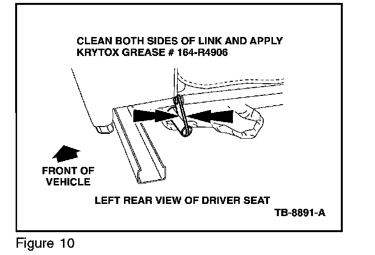 12. On the driver rear seat lift link, (Figure 9) Clean both sides of the lift link with a wire brush and apply Kyrtox grease (164-R4906) from the Rotunda Squeak and Rattle Kit (164-R4900) to the contact points. (Figure 10)