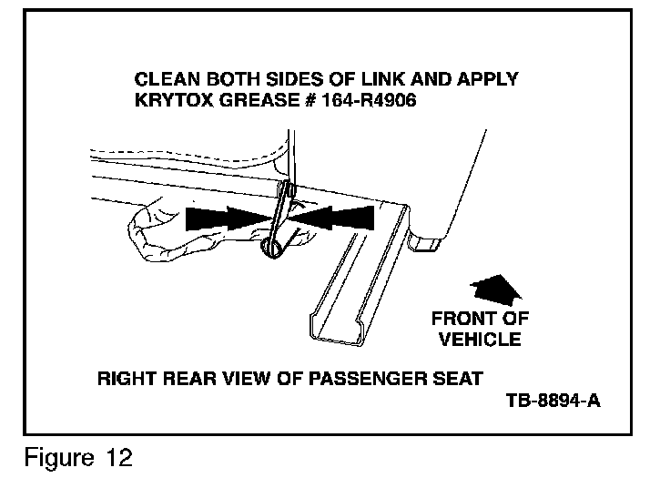 15. On the Passenger rear seat lift link, (Figure 12) Clean both sides of the lift link with a wire brush and apply Kyrtox grease (164-R4906) from the Rotunda Squeak and Rattle Kit (164-R4900) to both contact points. (Figure 13)