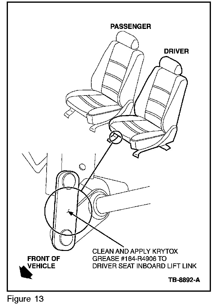 17. On the front driver seat inboard lift link, apply Kyrtox grease (164-R4906) from the Rotunda Squeak and Rattle Kit (164-R4900) to both contact points. (Figure 11)