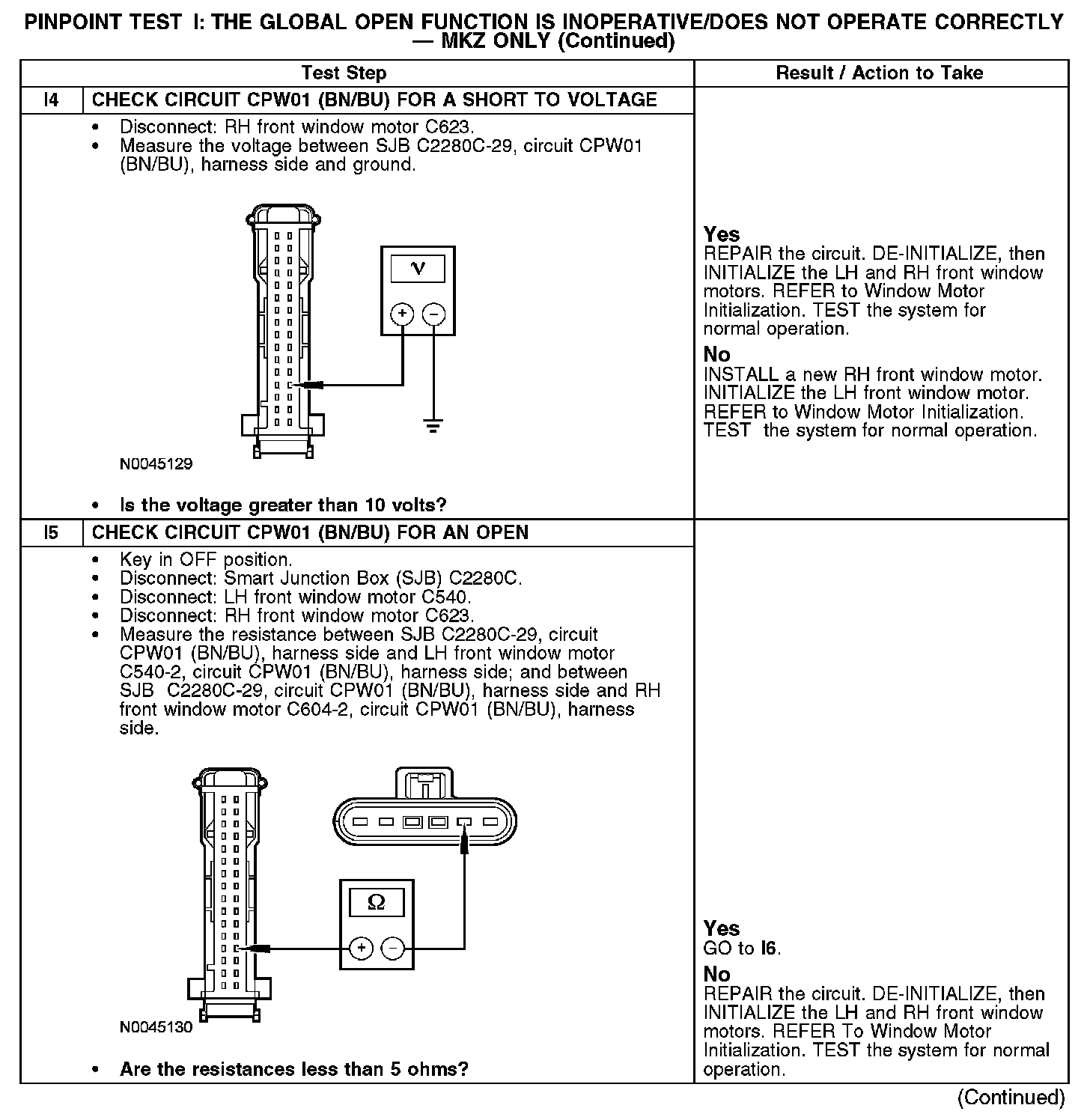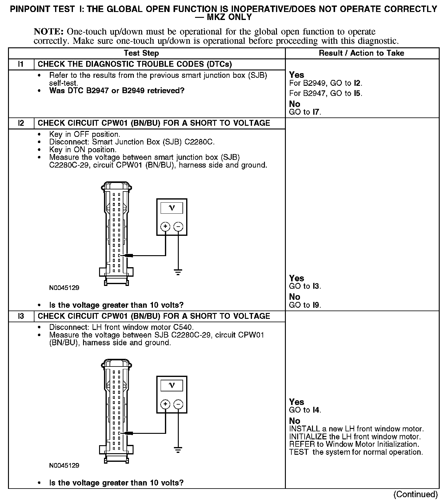 When the unlock button of the remote keyless entry (RKE) transmitter is held for 2 seconds the global open activates. The smart junction box (SJB) sends a signal on circuit CPW01 (BN/BU) to activate the one-touch down operation of both front windows.