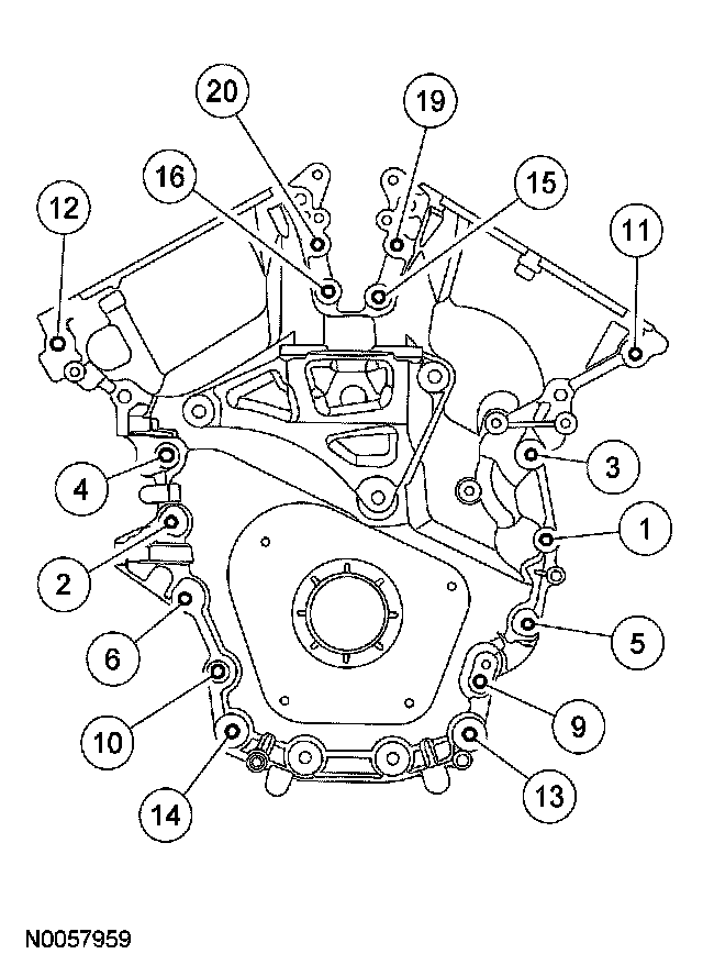NOTE: The remainder of the engine front cover bolts (1, 2, 3, 4, 5, 6, 9, 10, 11, 12, 13, 14, 15, 16, 19 and 20) must be installed and tightened within 60 minutes of the initial sealant application.