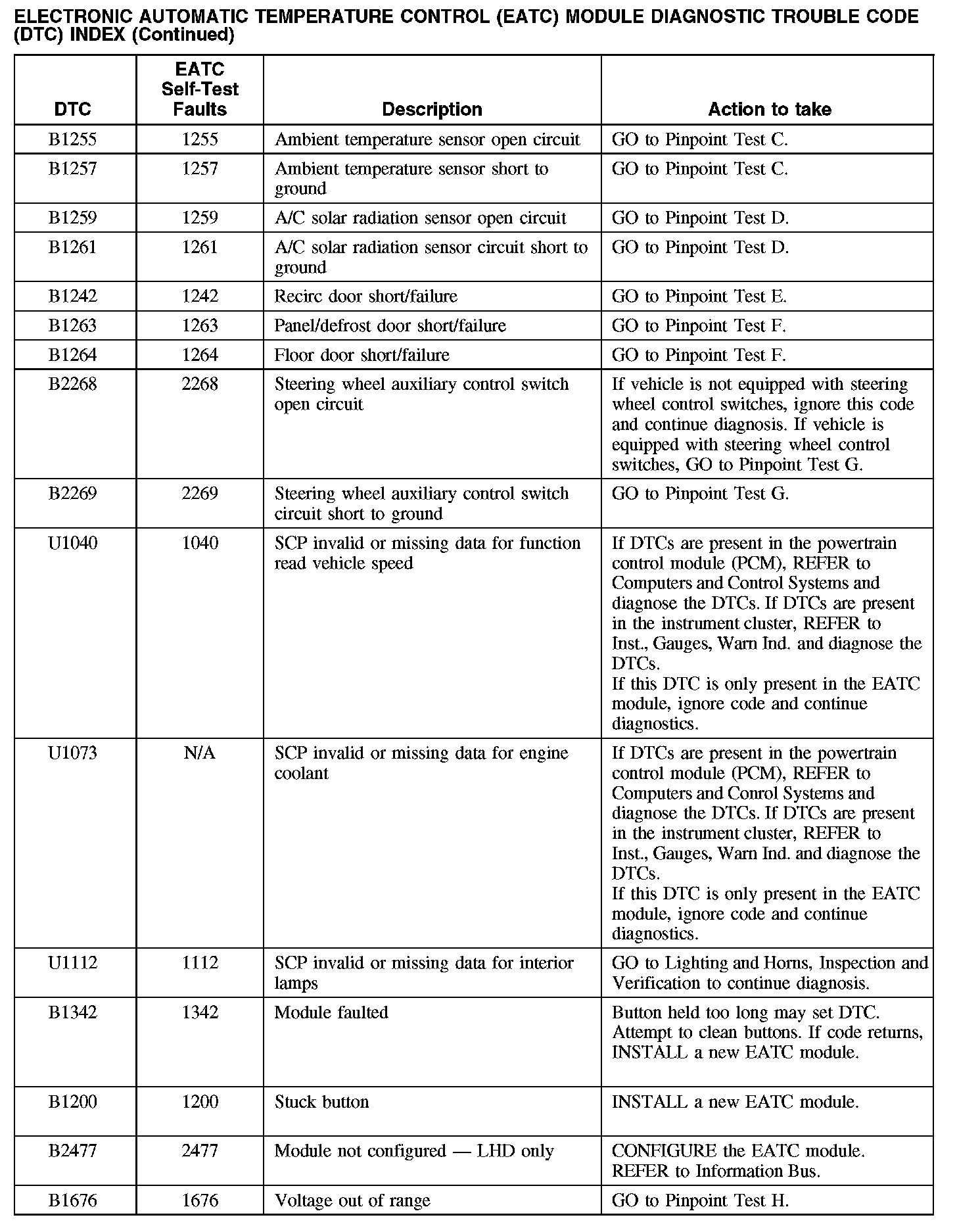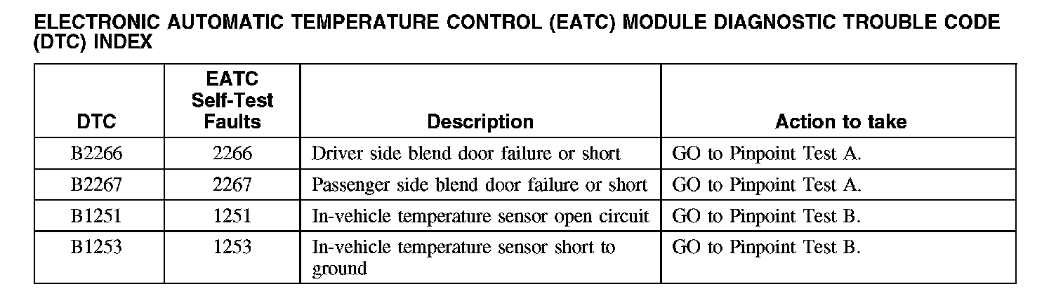 Electronic Automatic Temperature Control (EATC) Module Diagnostic Trouble Code (DTC) Index