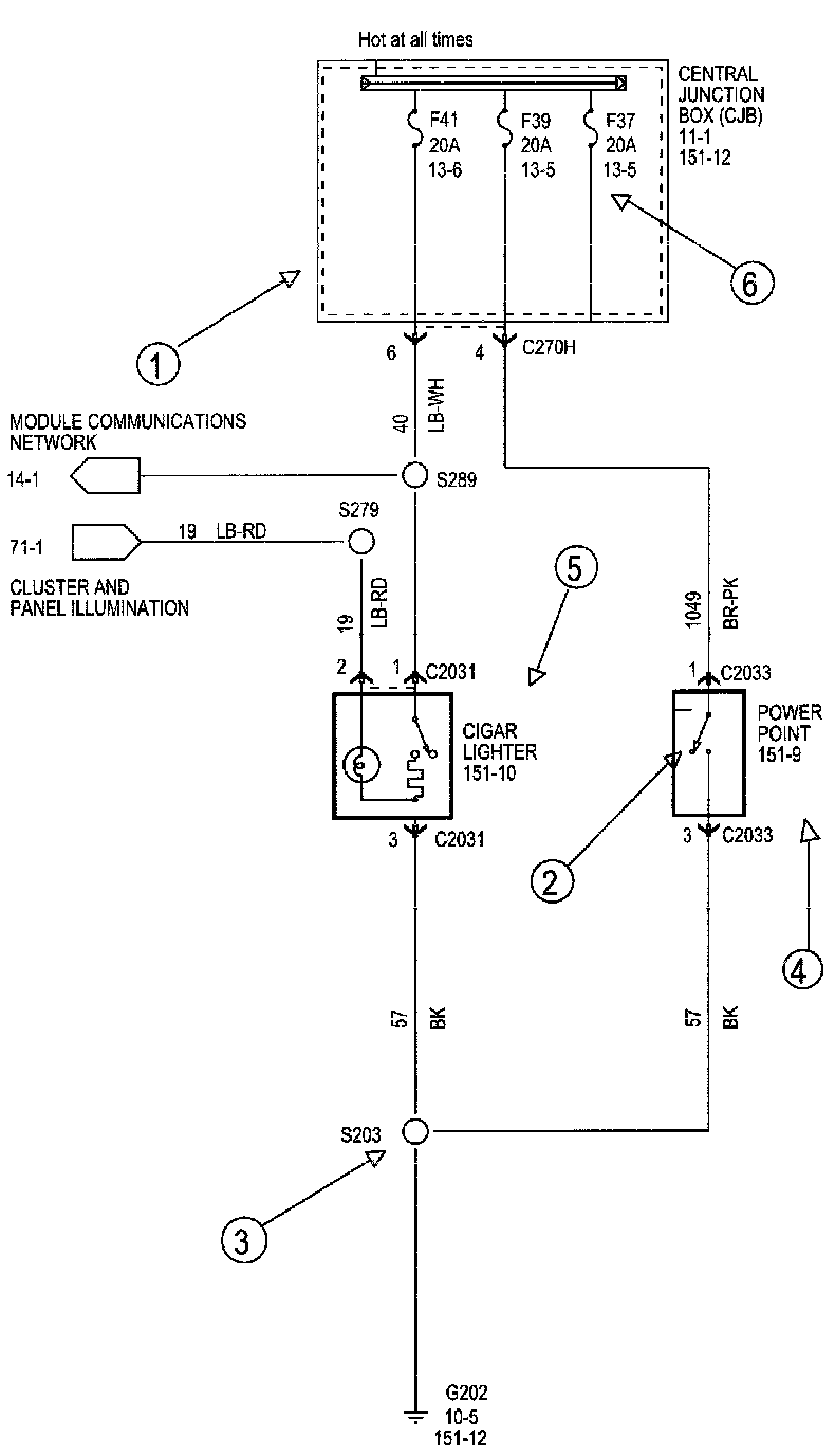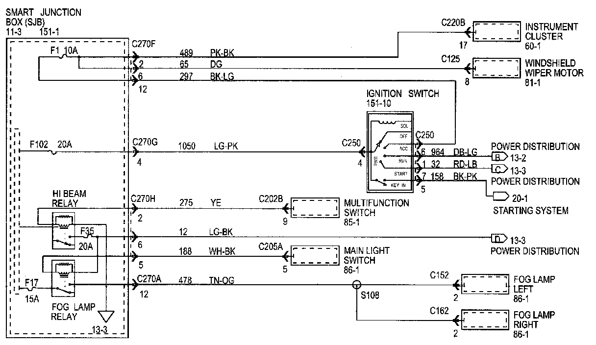 Each set normally starts with the component that powers the circuit, such as a fuse or the ignition switch. Current flow is shown from the power source at the top of the diagram to ground at the bottom of the diagram. A full representation of the power supply of a fuse or the power distribution from a fuse to various components is given in Power and Ground Distribution Diagrams. Full representation of the ground connections are shown in Power and Distribution Diagrams.