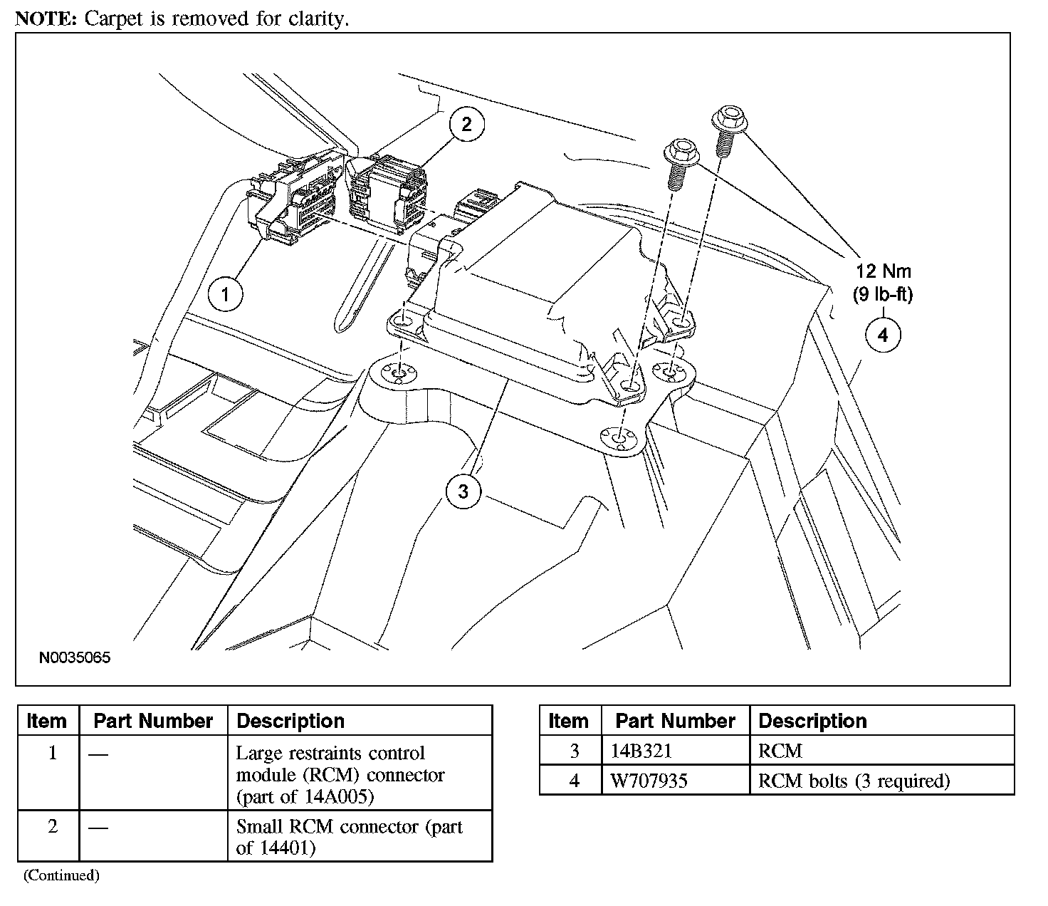 12. NOTE: When a new RCM is first installed in the vehicle, programmable module installation (PMI) must be carried out. The diagnostic trouble code (DTC) B2477 will be stored in the RCM memory (continuous fault) and will flash lamp fault code (LFC) 54 (or higher priority code if one exists) on the air bag indicator. The DTC B2477 cannot be cleared from memory until RCM PMI has been carried out.