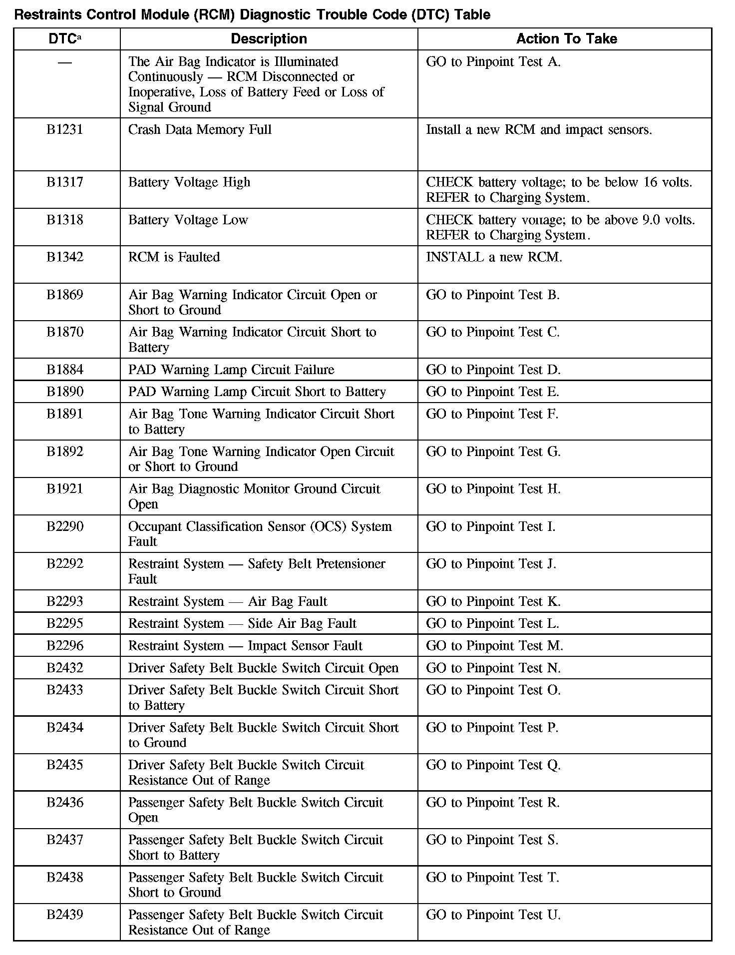 Restraints Control Module (RCM) Diagnostic Trouble Code (DTC) Table