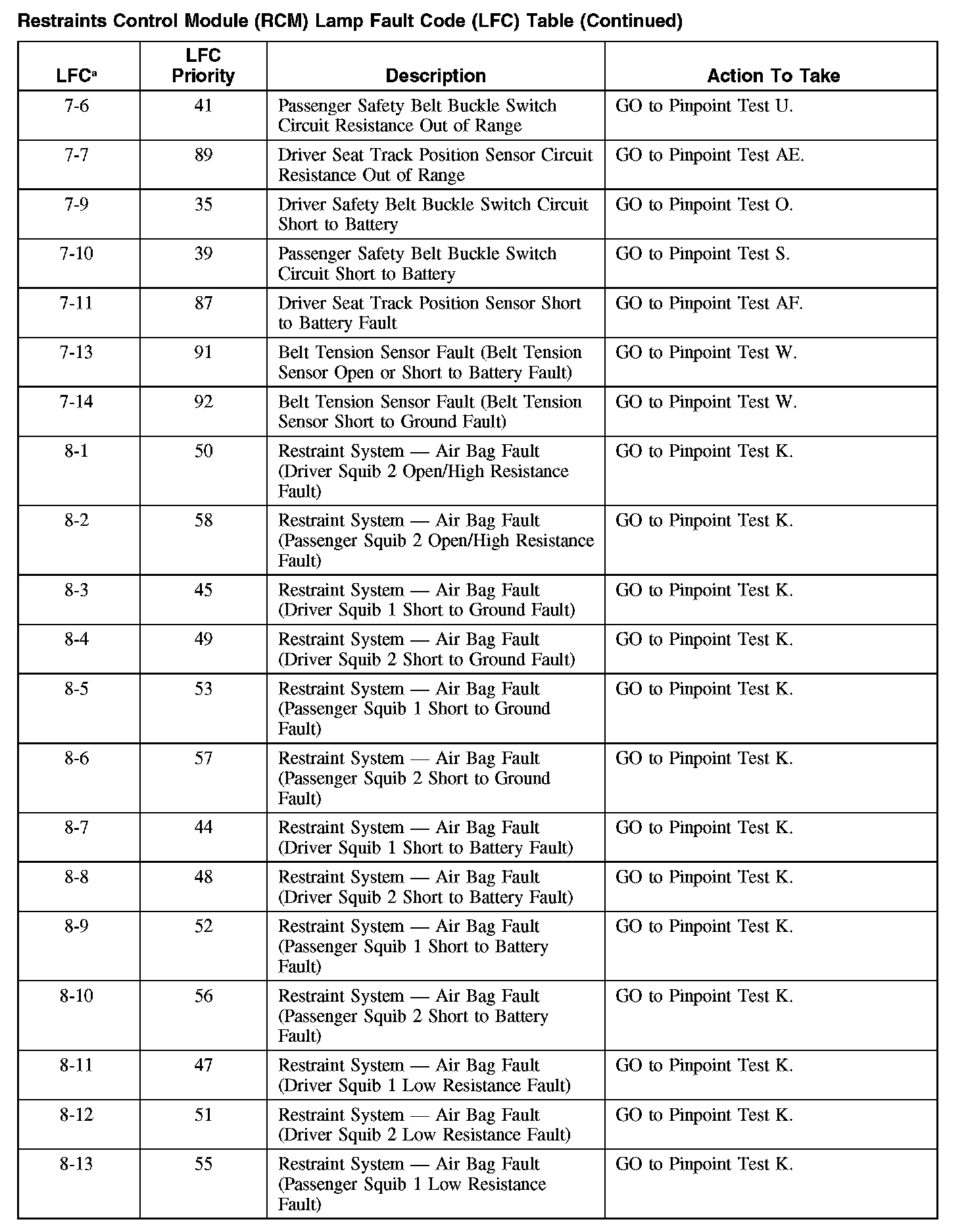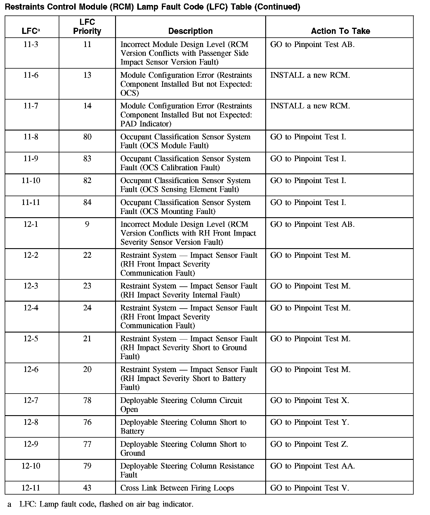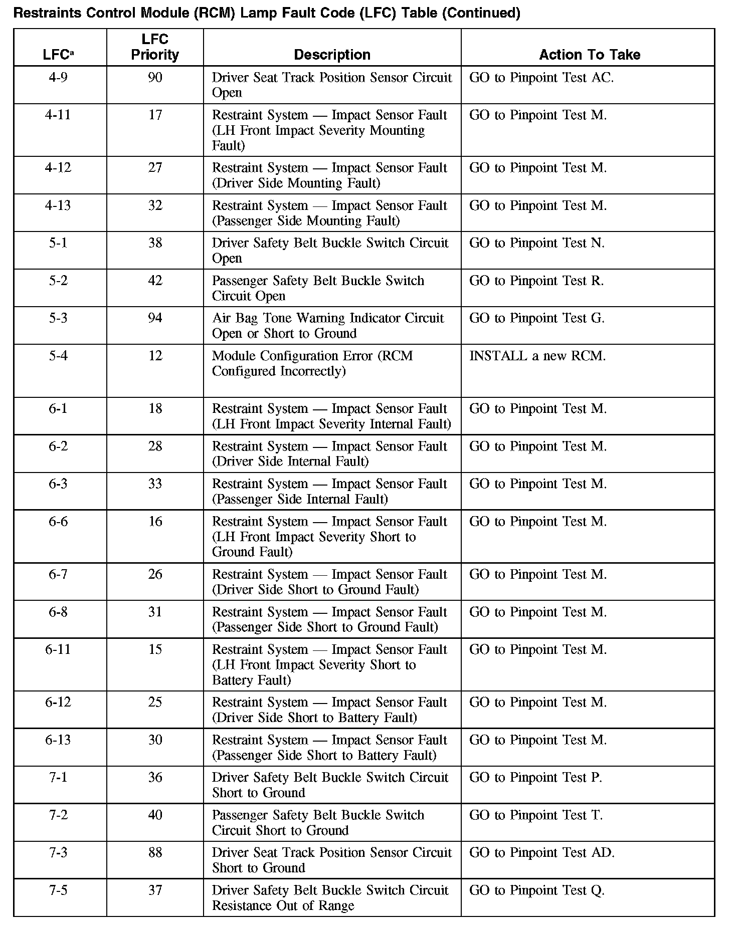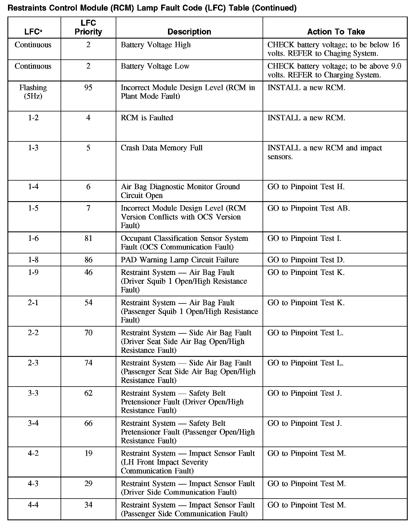 RESTRAINTS CONTROL MODULE (RCM) LAMP FAULT CODE (LFC) TABLERestraints Control Module (RCM) Lamp Fault Code (LFC) Table (Part 1):