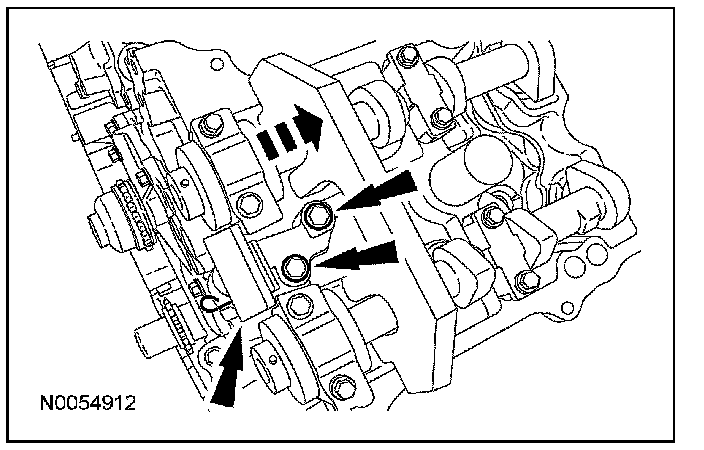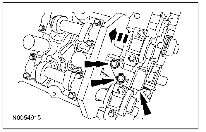 22. CAUTION: Make sure the dowels on the variable camshaft timing (VCT) housing are fully engaged in the cylinder head prior to tightening the bolts. Failure to follow this process will result in severe engine damage.
