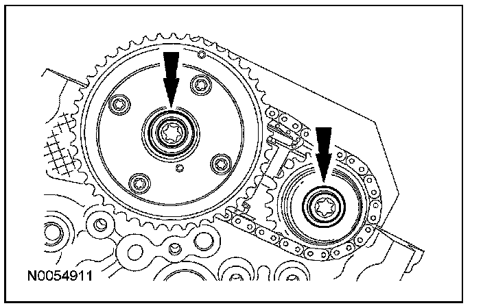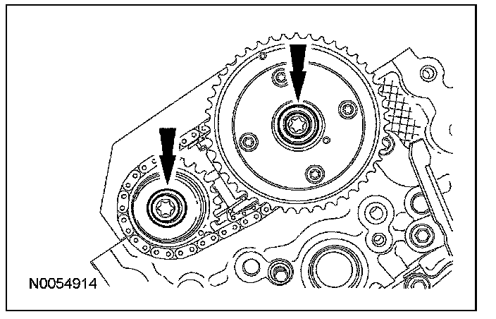 8. Assemble the LH VCT assembly, the LH exhaust camshaft sprocket and the LH secondary timing chain.