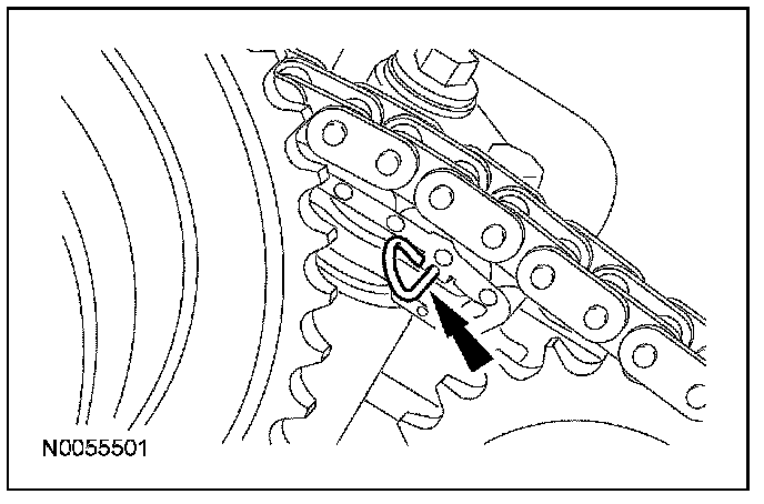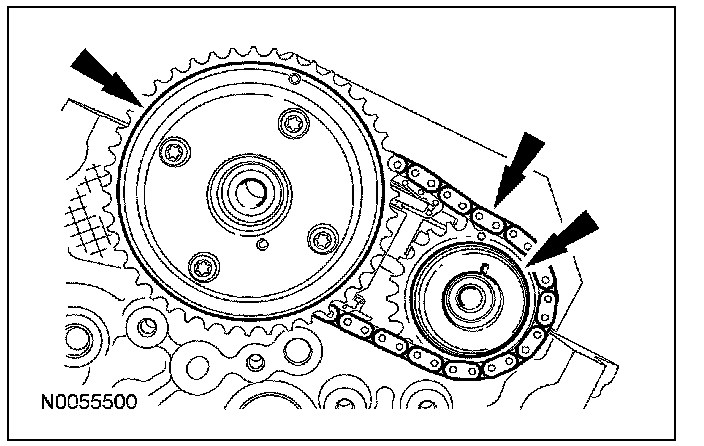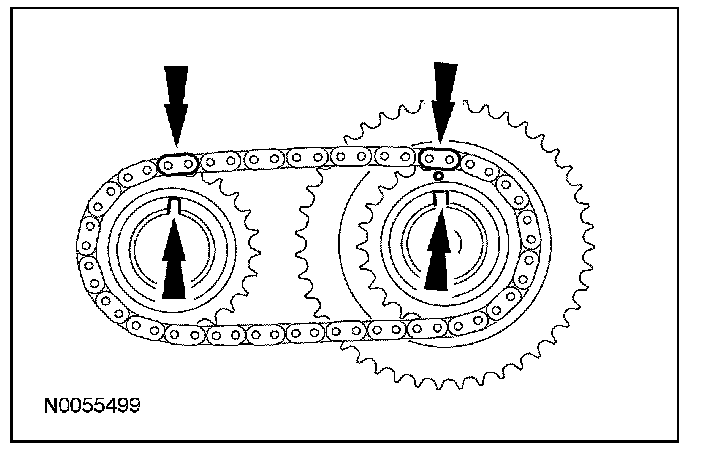 13. Install the primary timing chain with the colored links aligned with the timing marks on the VCT assemblies and the crankshaft sprocket.