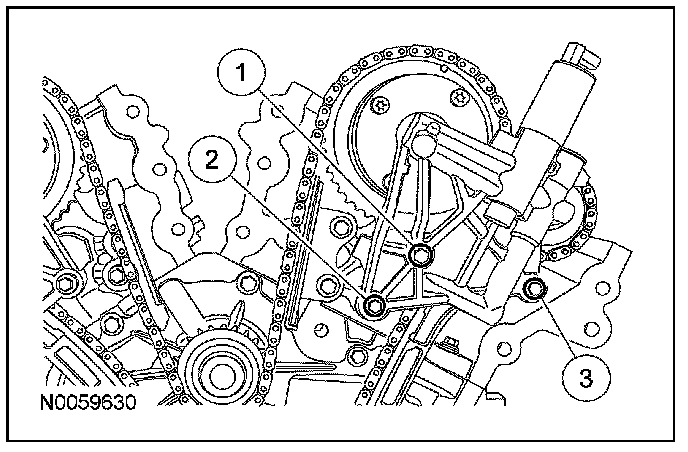 15. Install the lower LH primary timing chain guide and the 2 bolts.