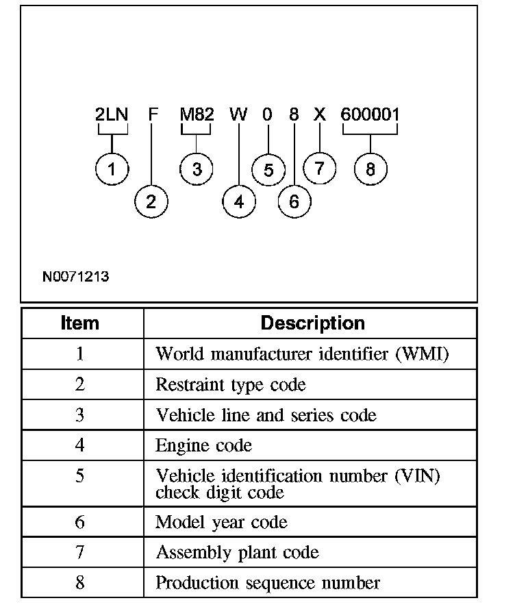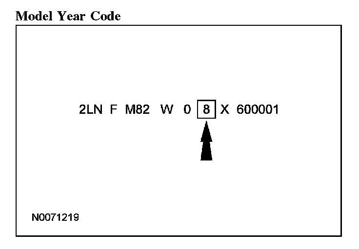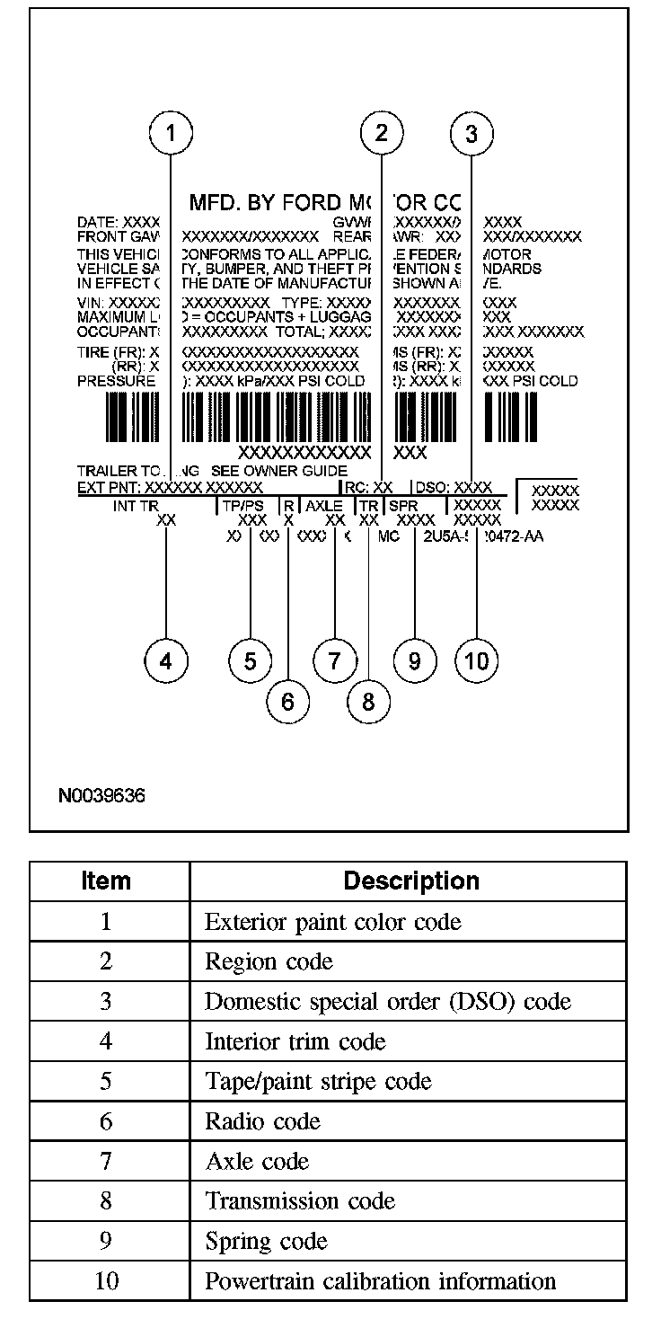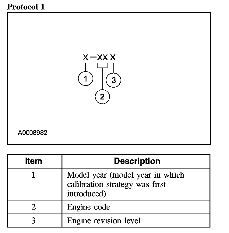 Powertrain calibration information is printed in the lower right corner of the VC label. Only the base calibration information is printed. Revision levels will not appear, however, they can be found in OASIS. For the current model year, Ford Motor Company is using 3 different protocols which describe powertrain base calibration. These protocols are designed to provide worldwide standardization for vehicle calibration. If the electronic calibration strategy has been used since 1998 and carried into the current model year, Protocol 1 will be used. Refer to Protocol 1 below. If the electronic calibration strategy has been used since 1999 and is carried into the current model year, Protocol 2 will be used. Refer to Protocol 2 below. For electronic calibration strategies introduced since the 2000 model year, use Protocol 3. Refer to Protocol 3 below.