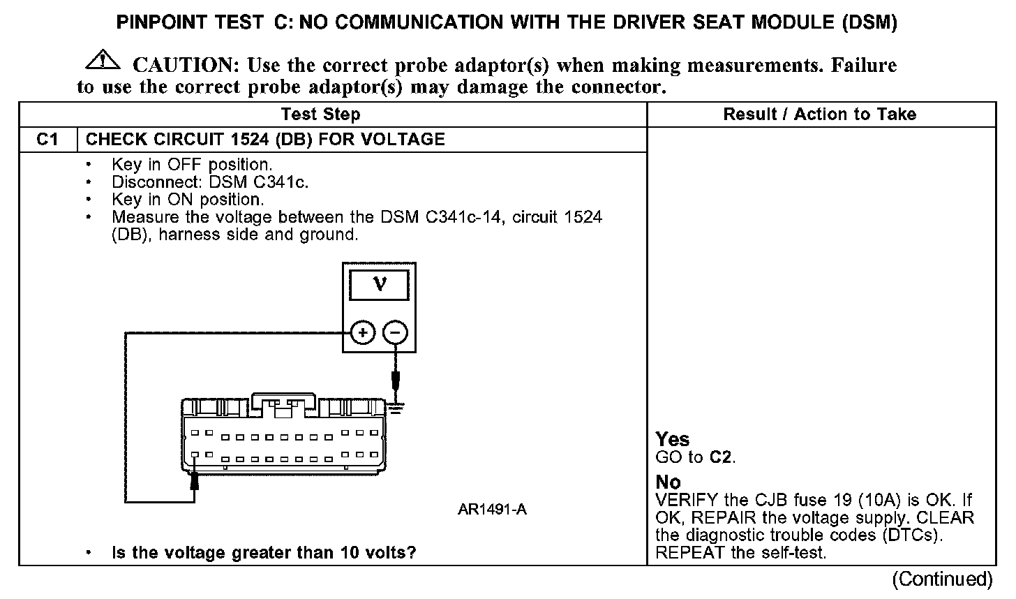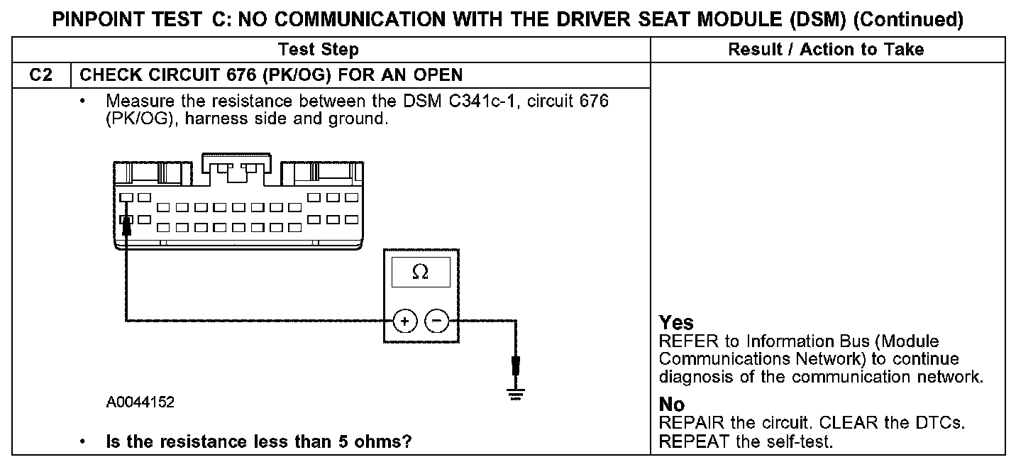 PINPOINT TEST C: NO COMMUNICATION WITH THE DRIVER SEAT MODULE (DSM)C1:
