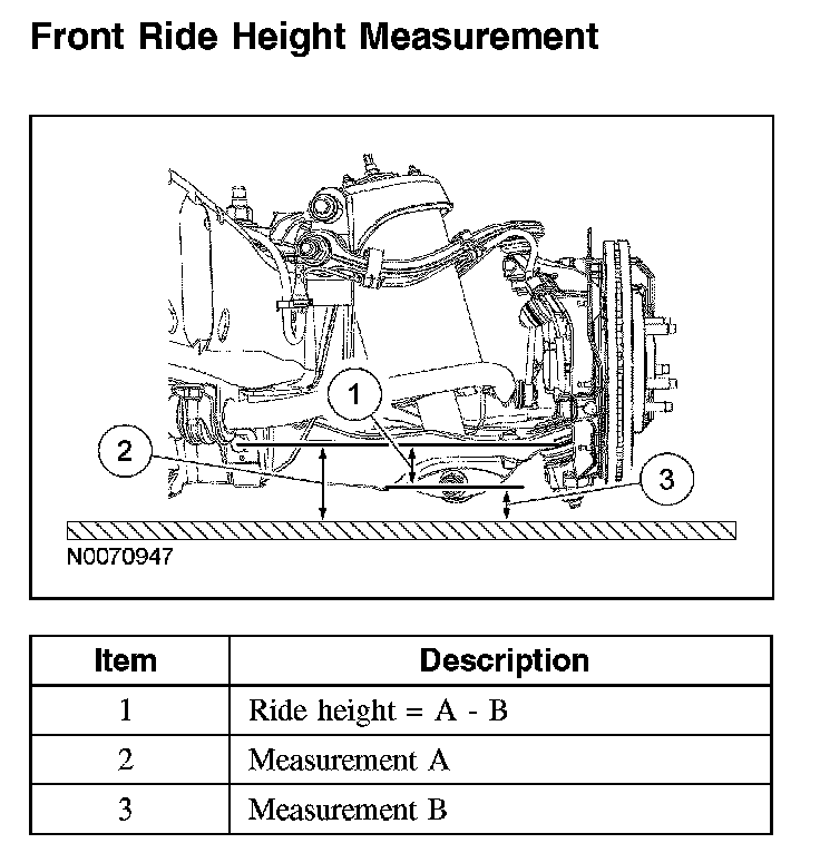 Front Ride Height MeasurementNOTE: Make sure that the vehicle is positioned on a flat, level surface and the tires are inflated to the correct pressure. Vehicle should have a full tank of fuel.