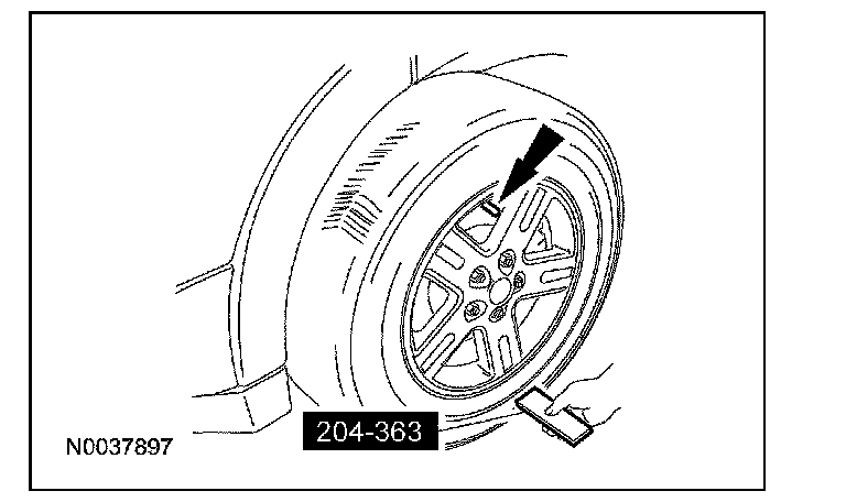 Place the activation tool on the LF tire sidewall opposite (180 degrees) from the valve stem. Press and release the test button on the special tool. The horn will sound briefly to indicate that the tire pressure sensor has been recognized by the DDM. Click here to view an animated version of this procedure.