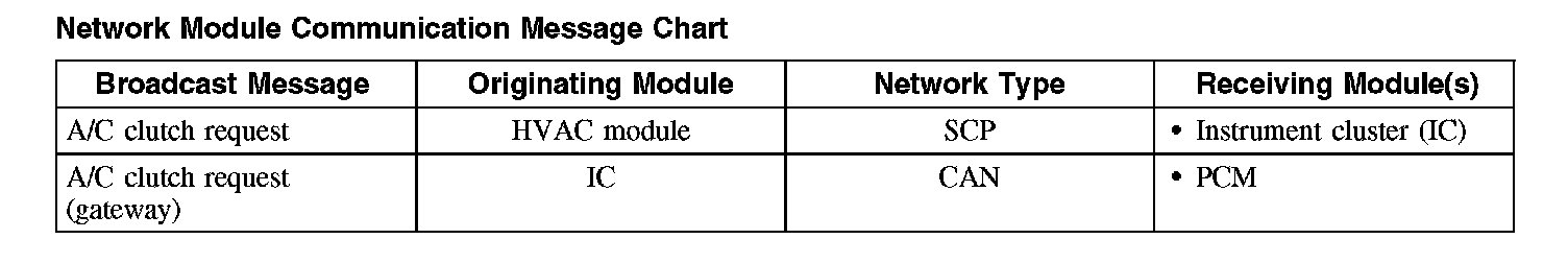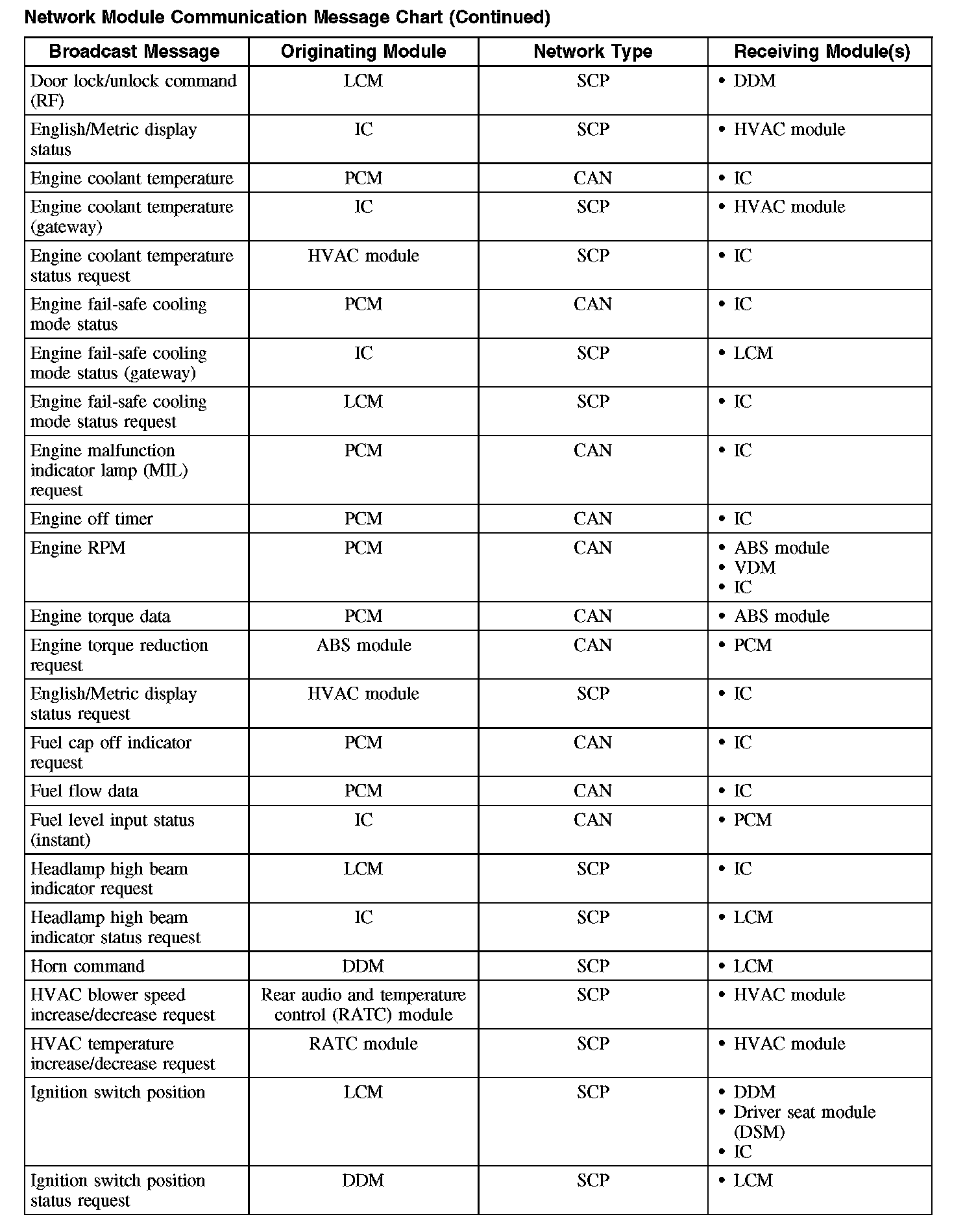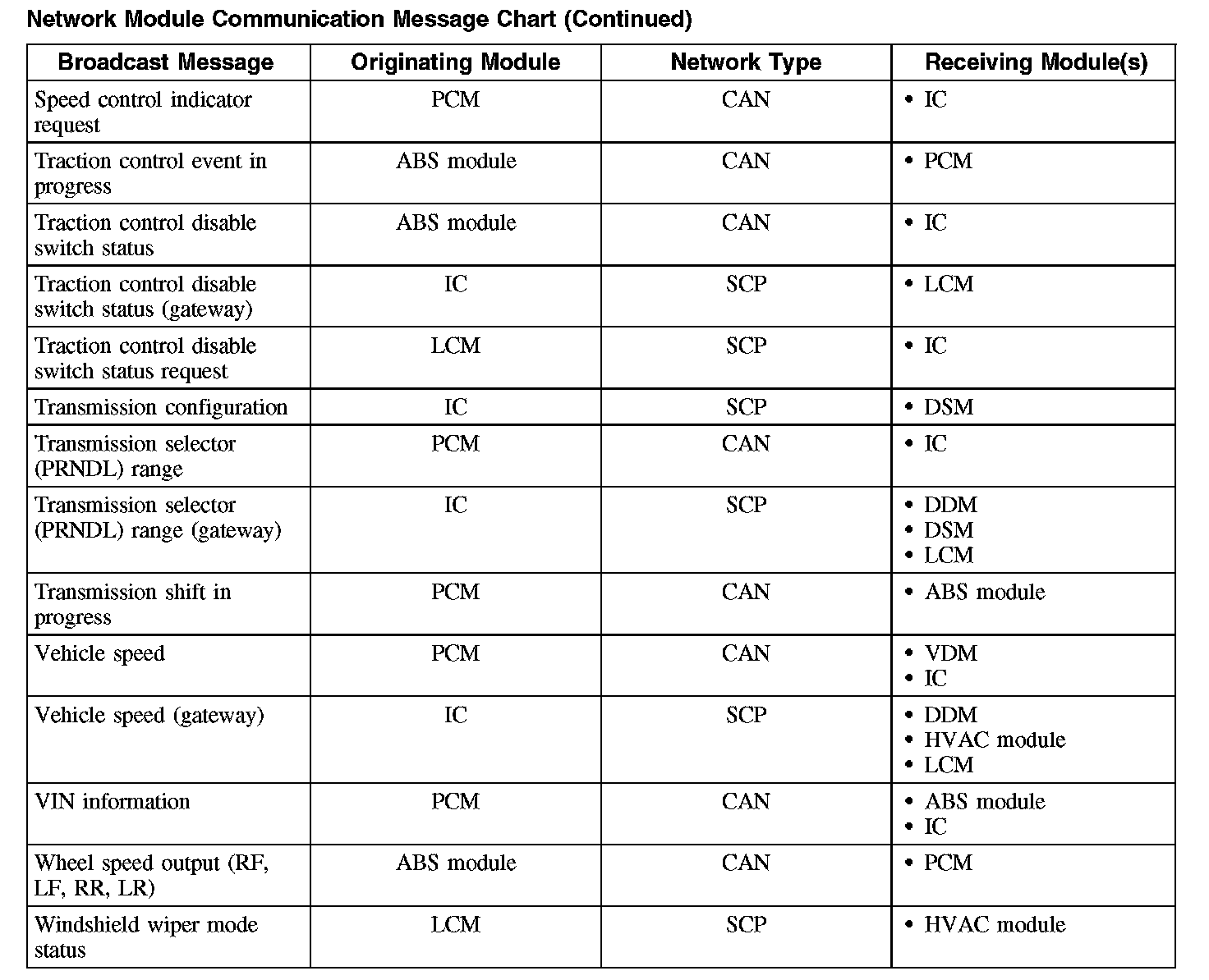 The following chart describes all network messages broadcast on the standard corporate protocol (SCP) and controller area network (CAN) and the module(s) that receive the message: