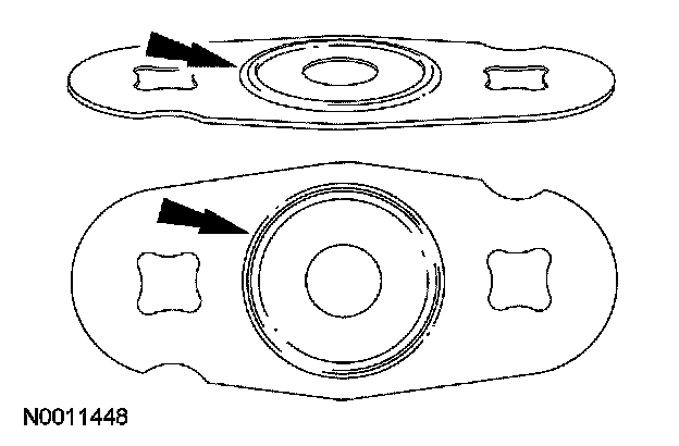 - Install a new EGR system module gasket with the side that has the raised circle facing the intake manifold.