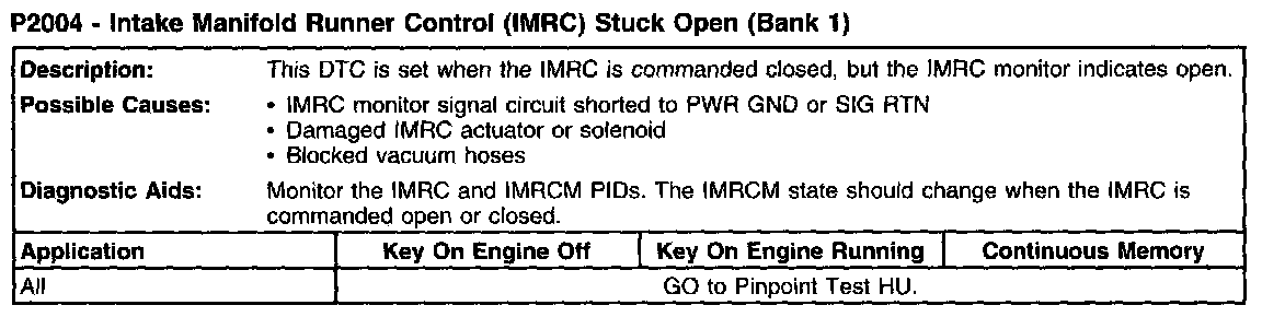 P2004 - Intake Manifold Runner Control (IMRC) Stuck Open (Bank 1):