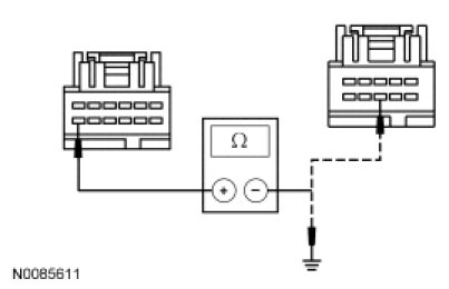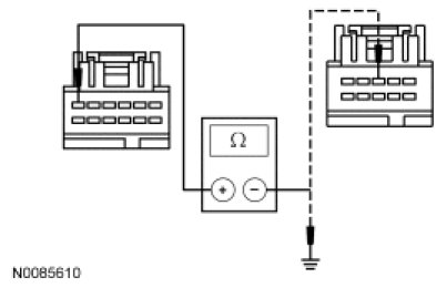 - Measure the resistance between the FDIM C2123-12, circuit RMN14 (GY/BN), harness side and the ACM C2253b-8, circuit RMN14 (GY/BN), harness side; and between the FDIM C2123-12, circuit RMN14 (GY/BN), harness side and ground.
