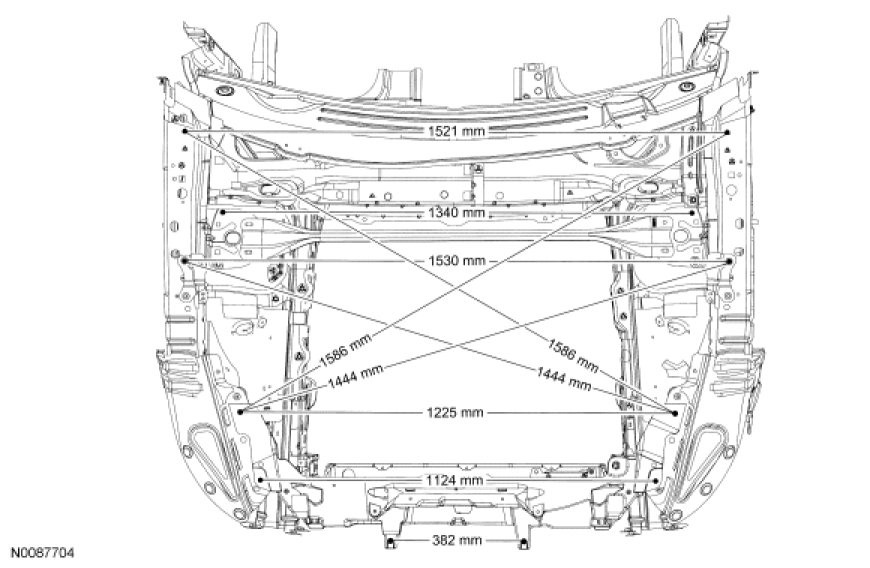 NOTICE: The radiator bolster is constructed of magnesium. If damage occurs to the radiator support component, it should not be repaired or incorrect vehicle operation may result. A new component should be installed.